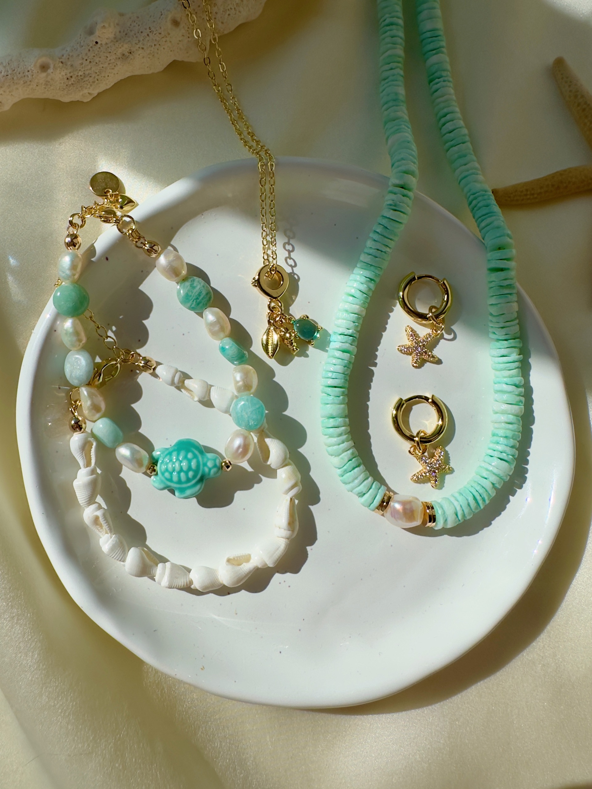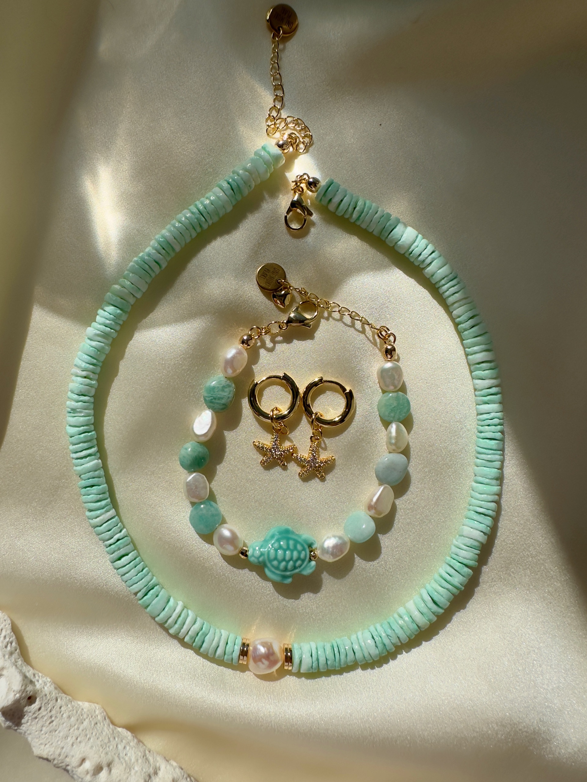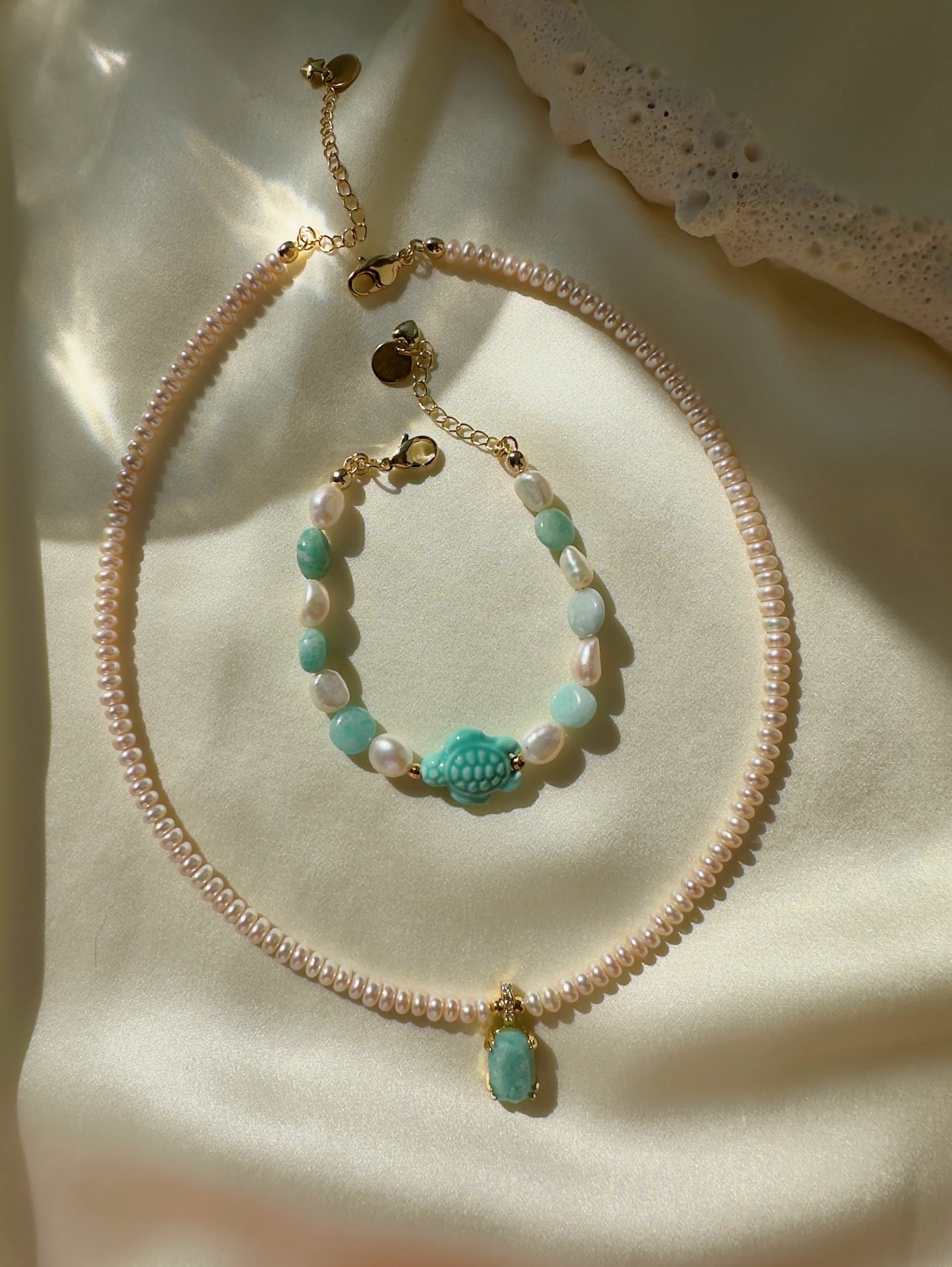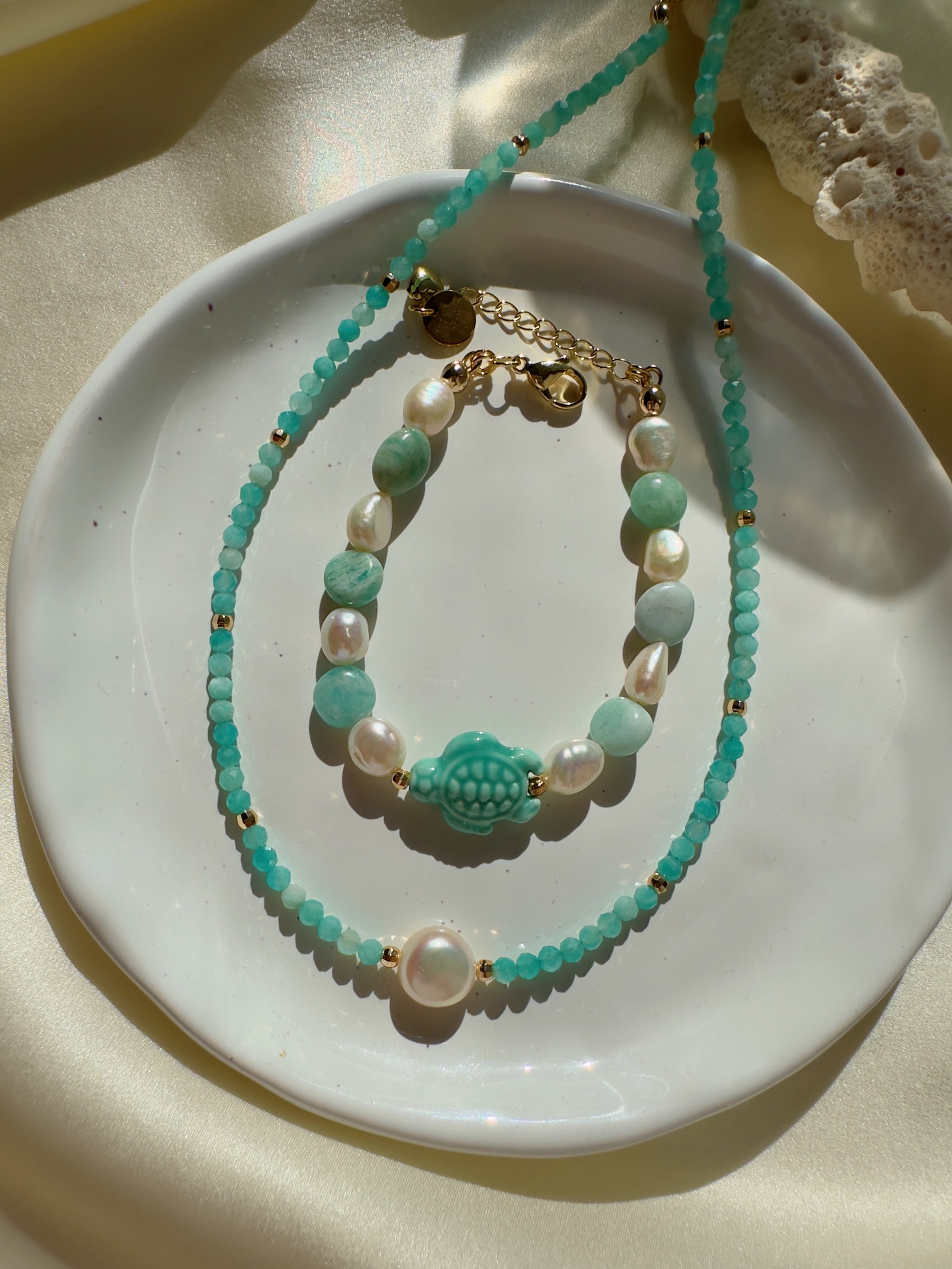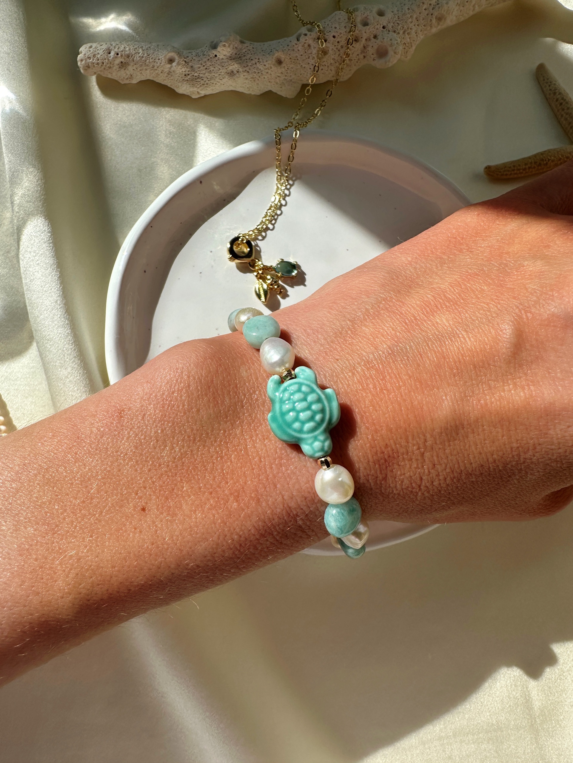 Браслет из натурального амазонита, керамики и Натурального пресноводного культивированного жемчуга