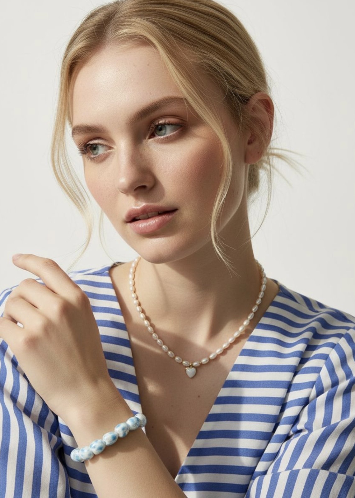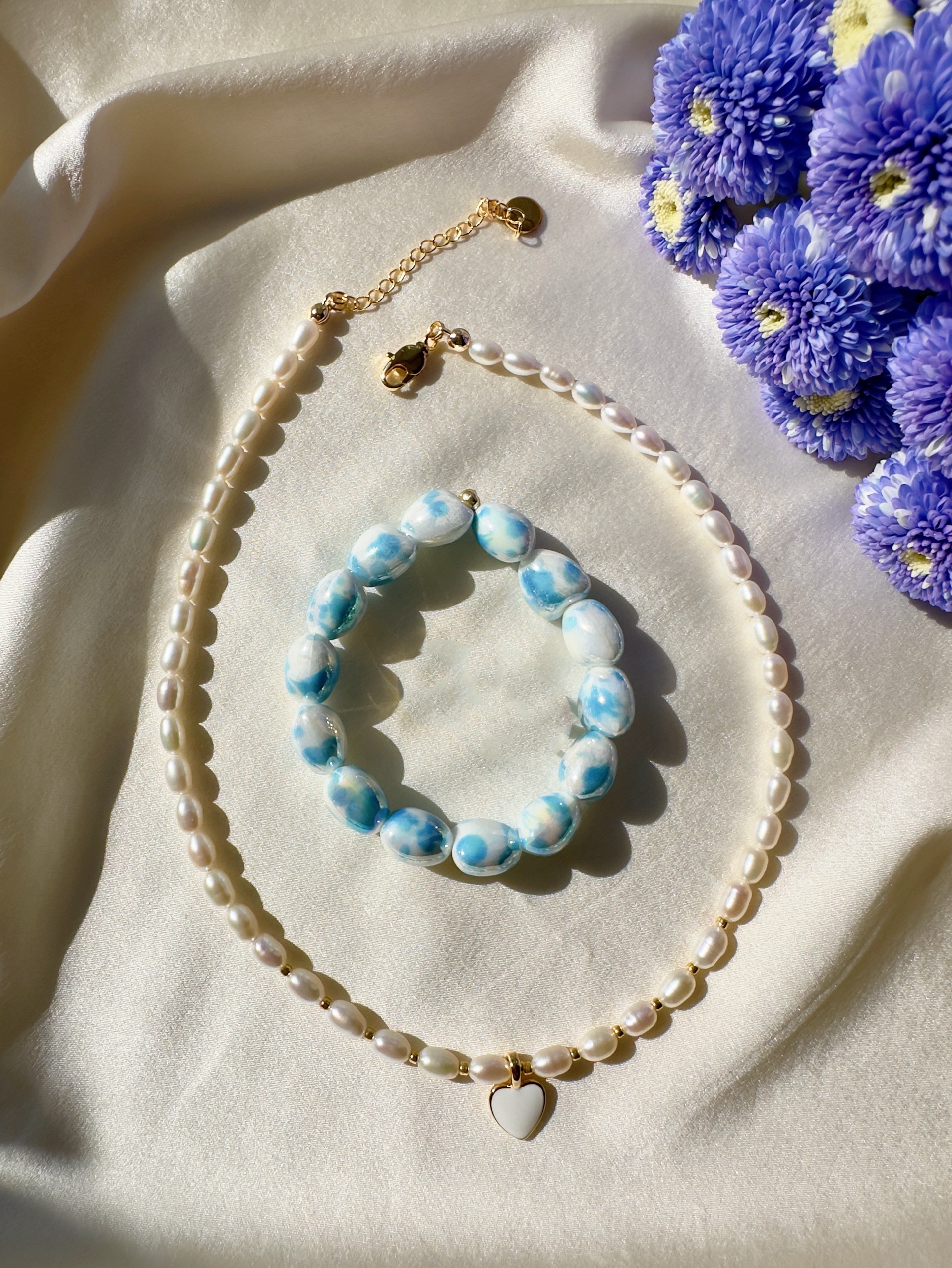 Браслет из керамики в форме сердец с голубым принтом