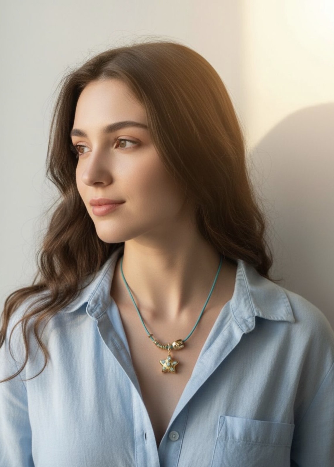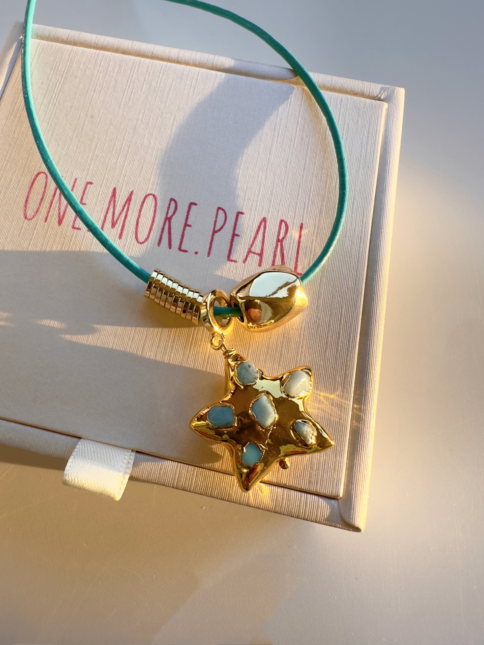 Голубой Кожаный шнурок с подвеской из латуни с покрытием Золото 18К с натуральным ларимаром и подвесками