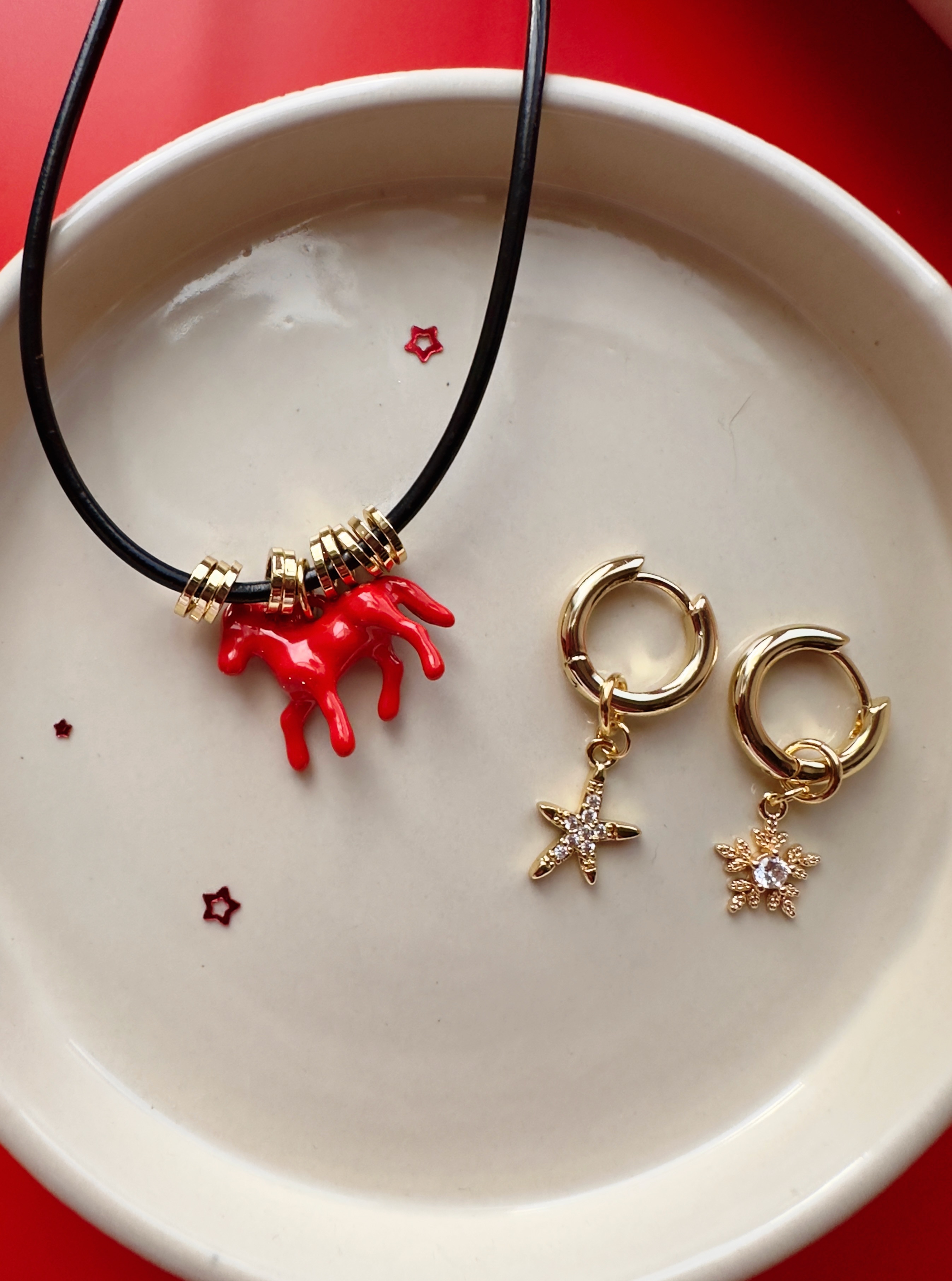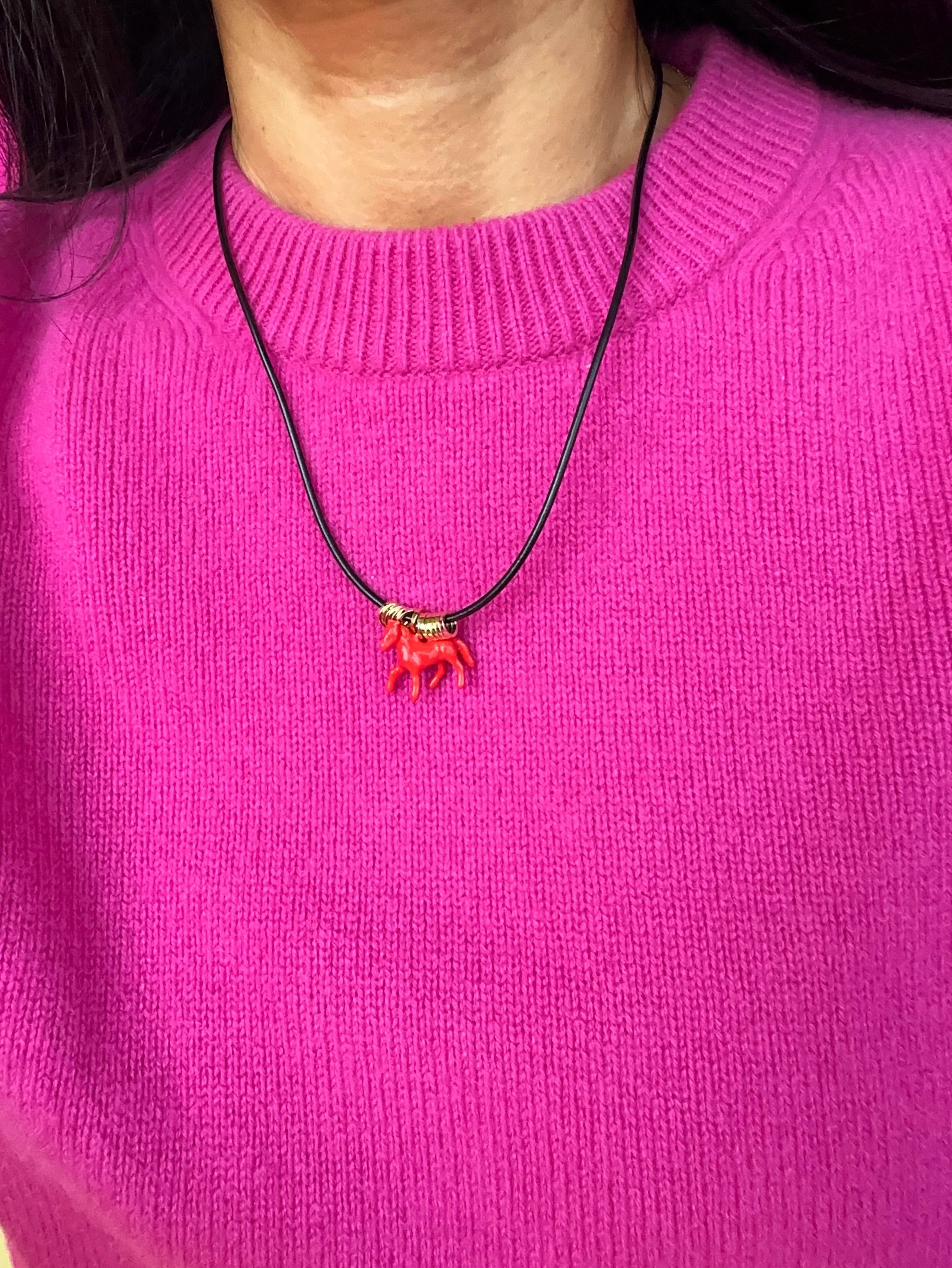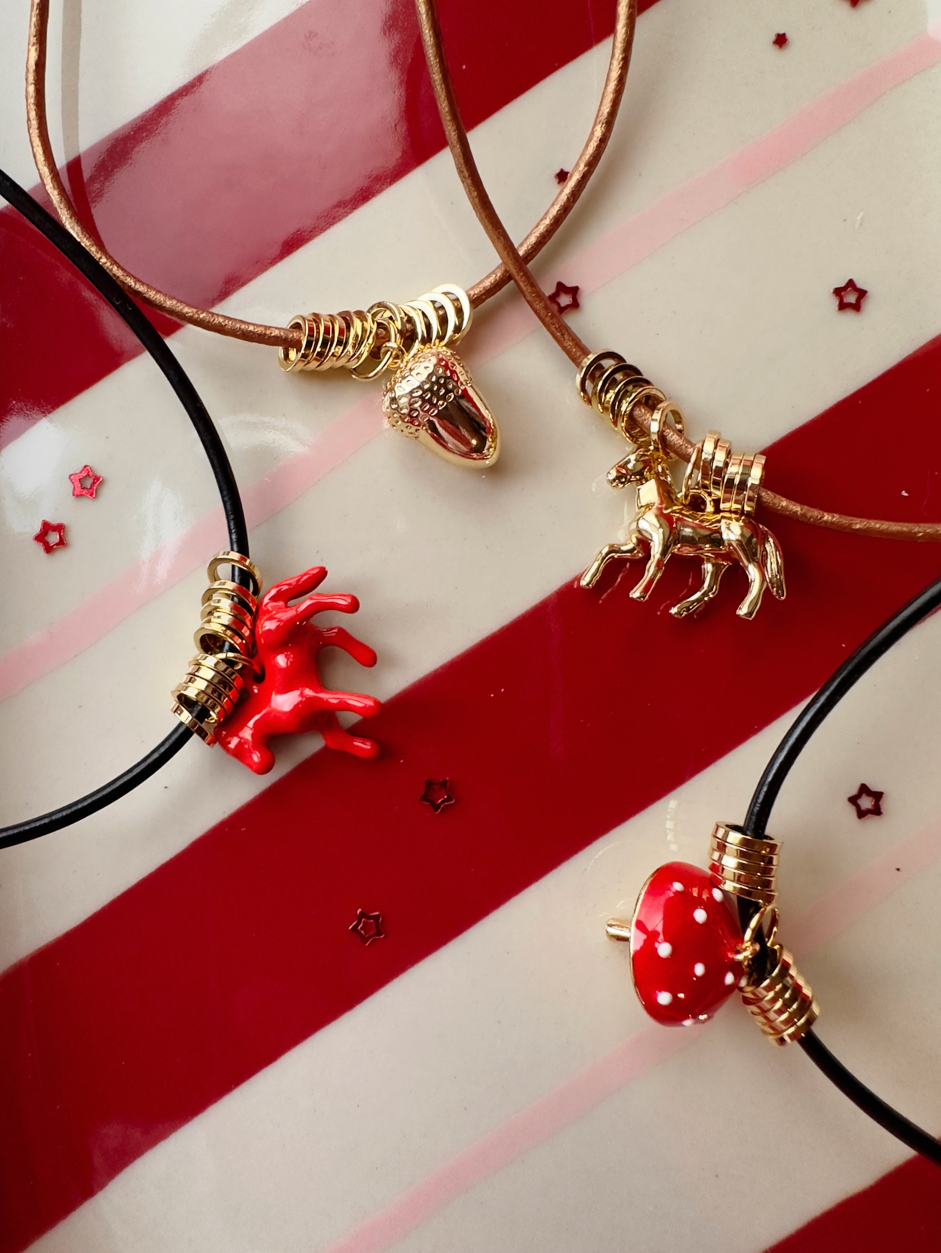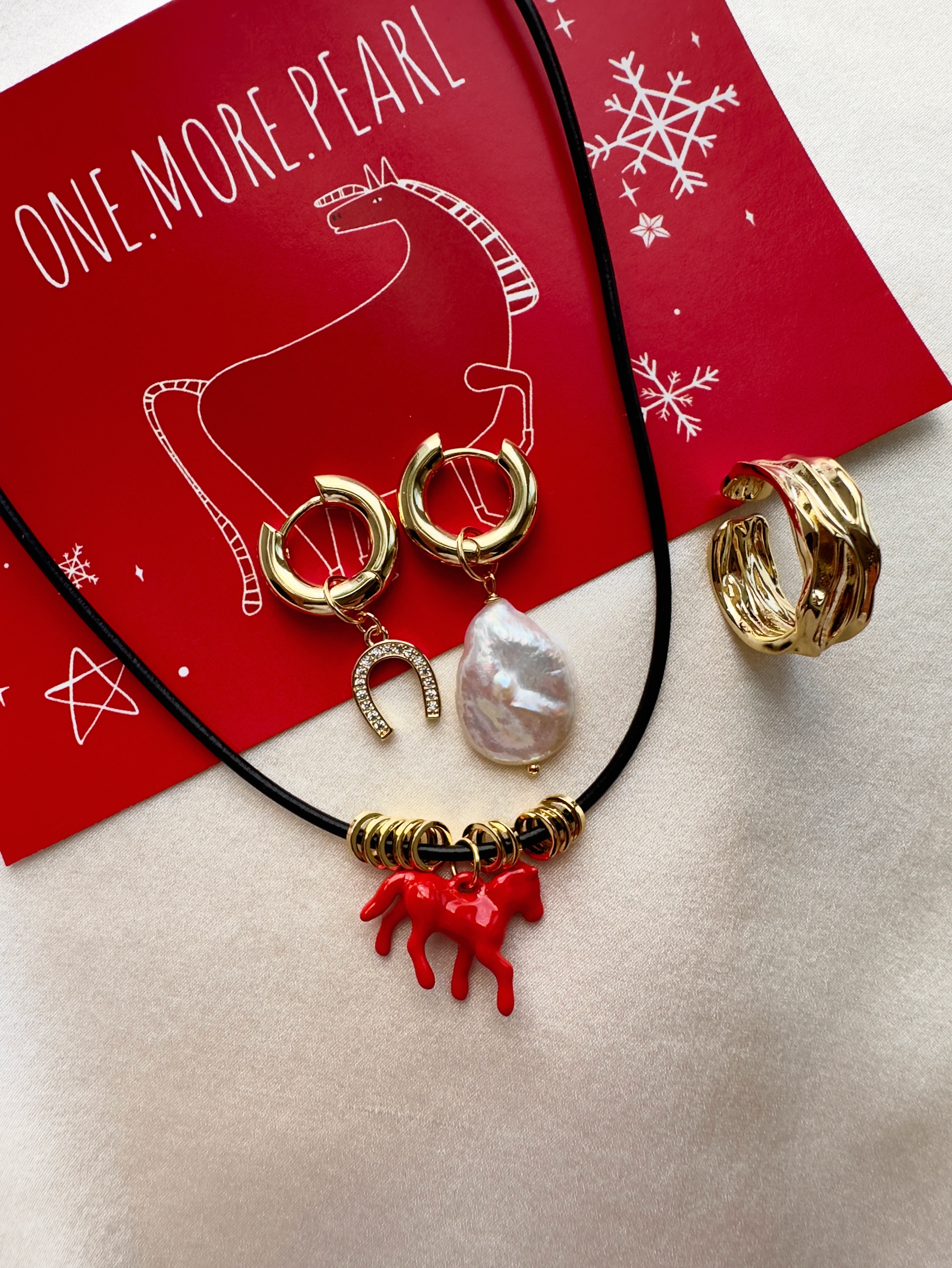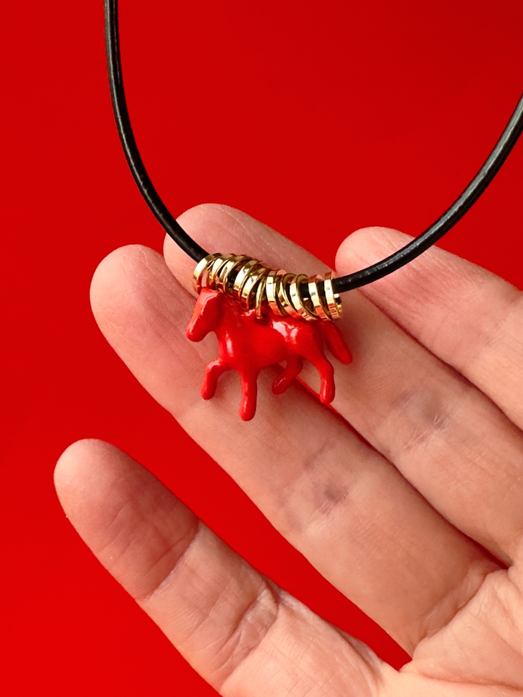 Кожаный шнурок с подвеской из латуни с покрытием Золото 18К, в форме красной лошадки и колечками