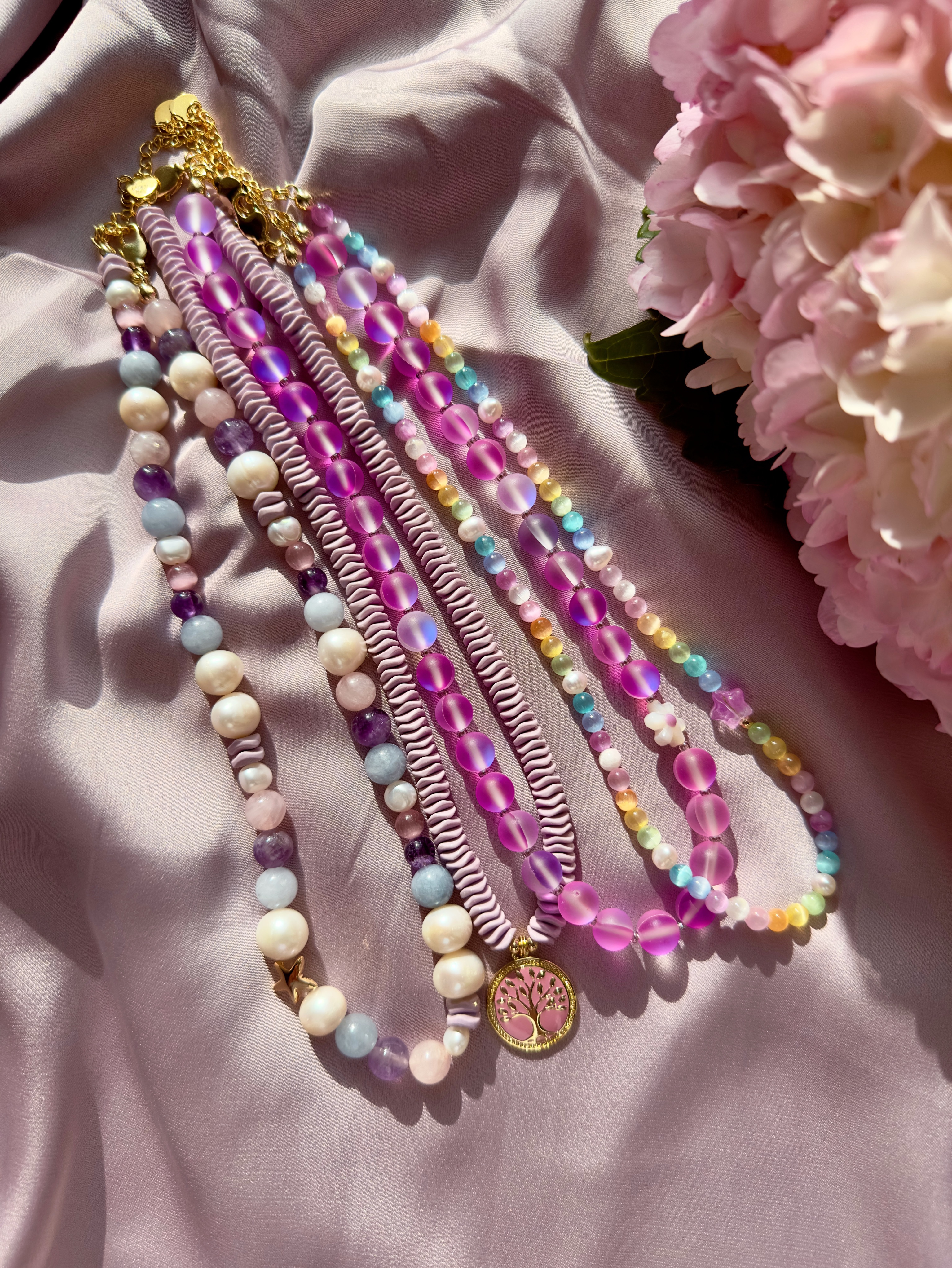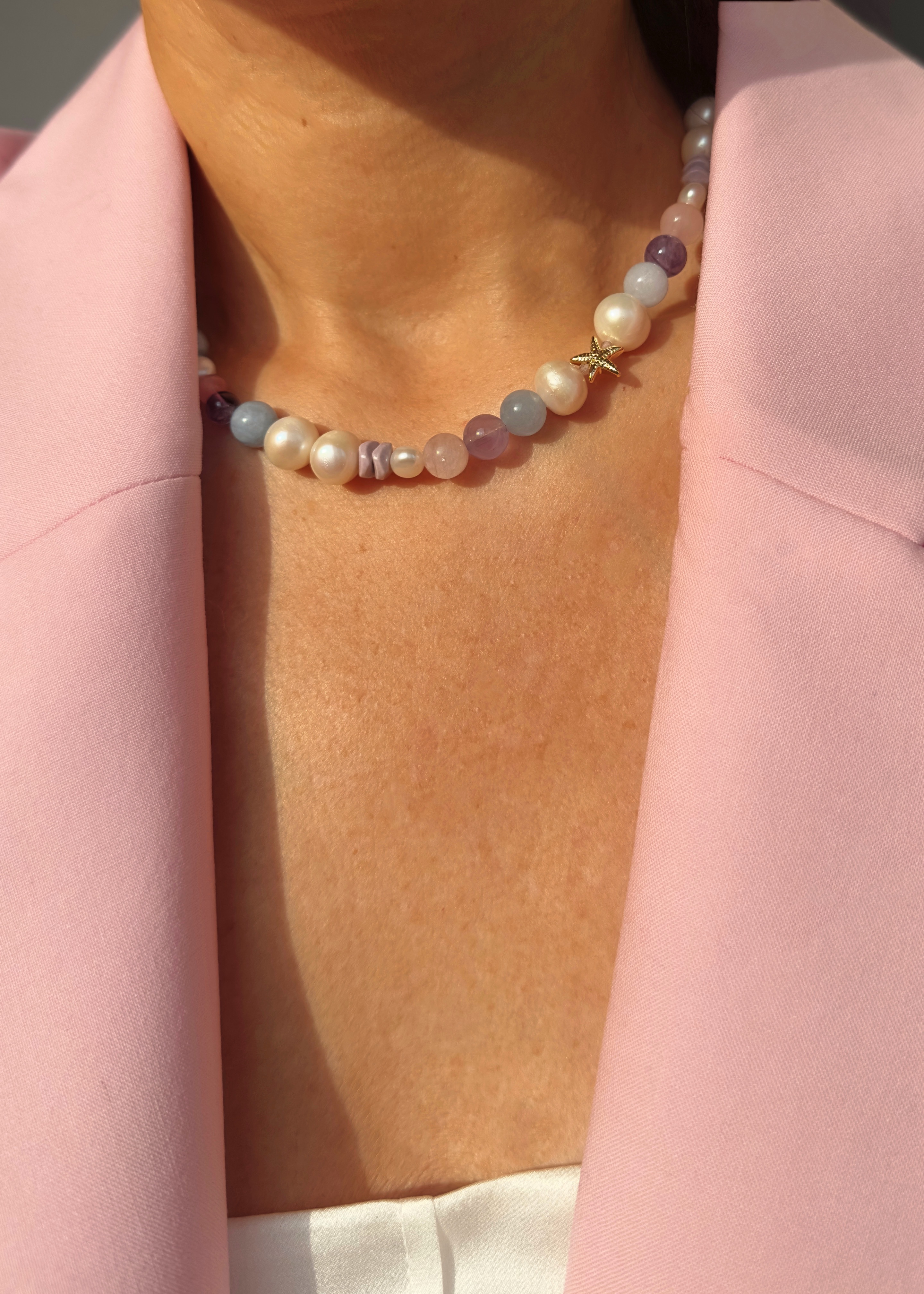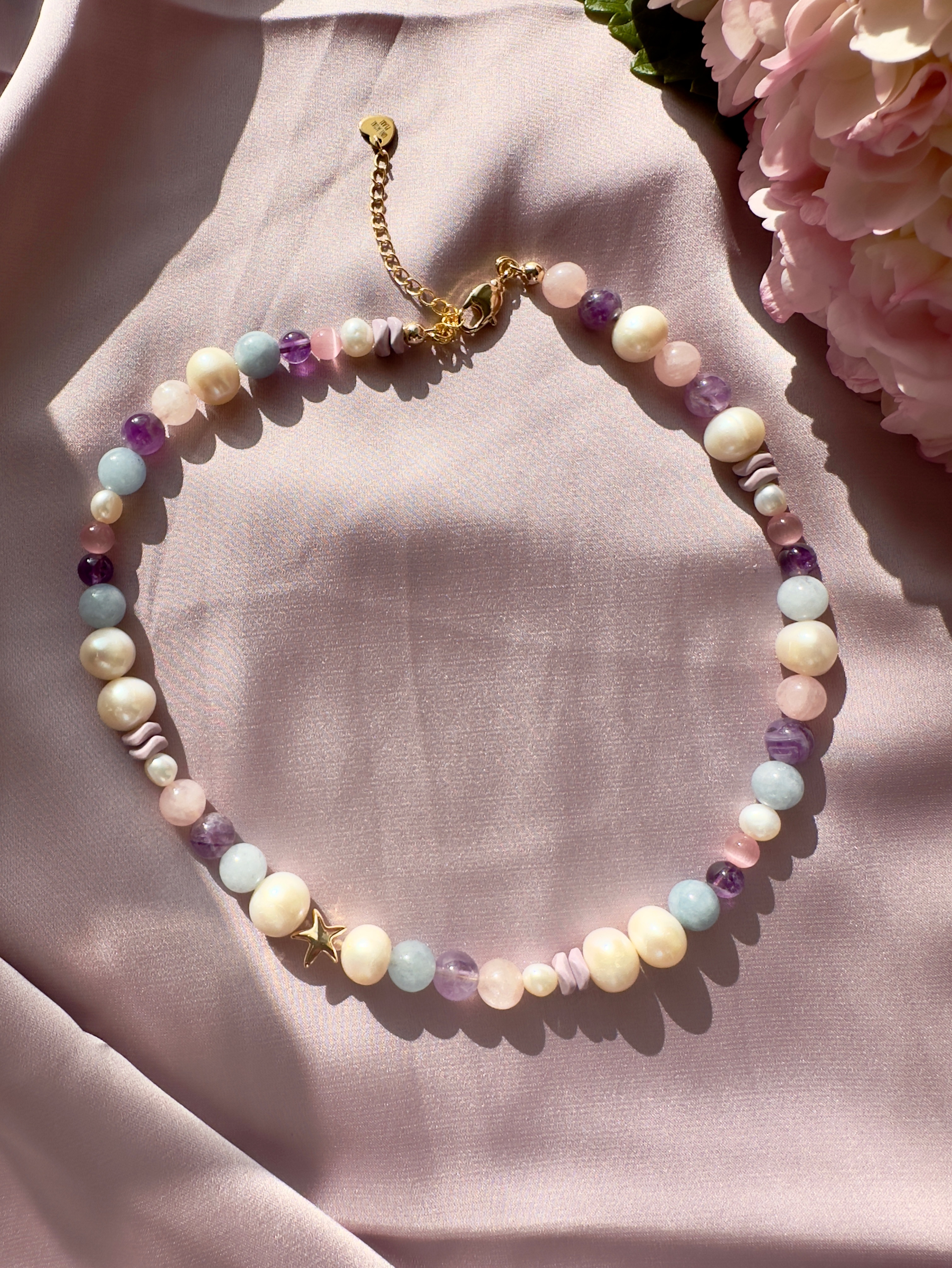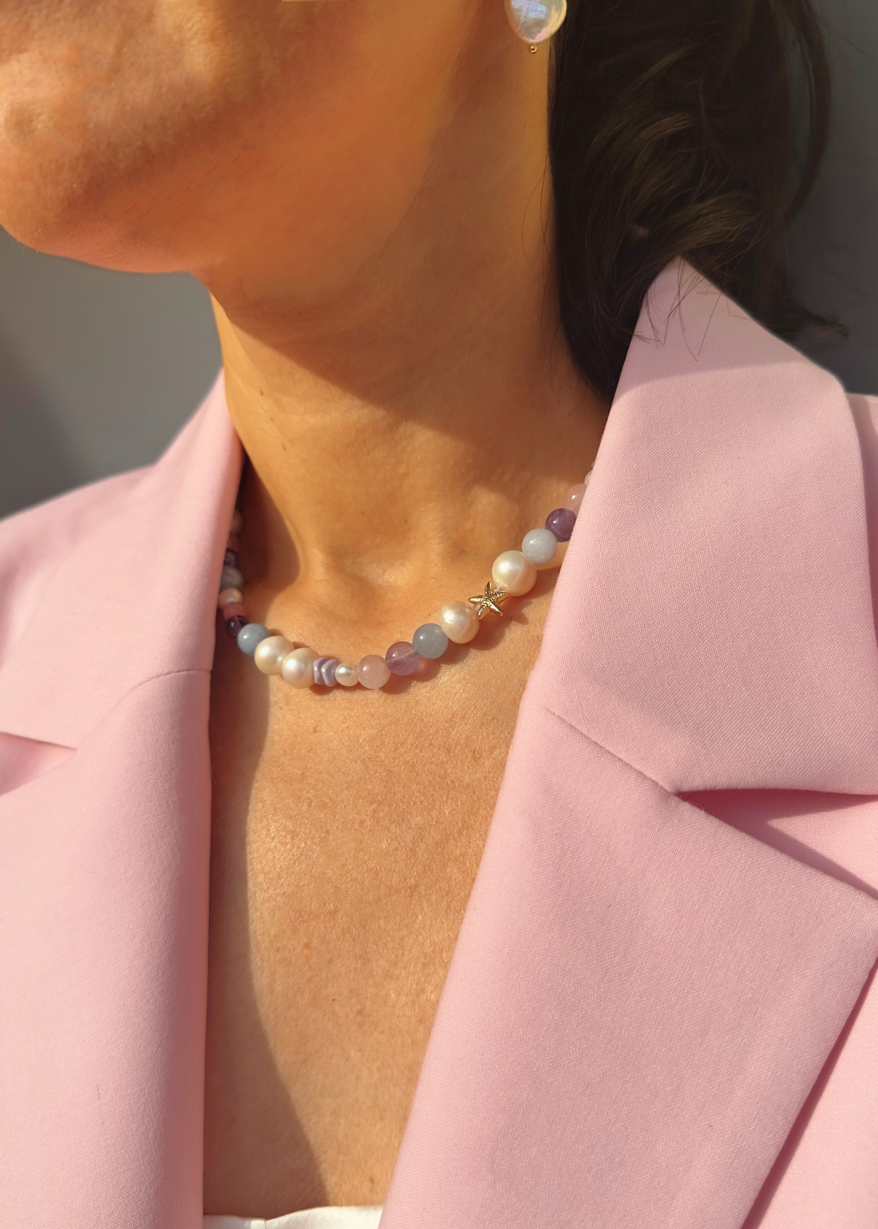 Чокер из натурального аквамарина, аметиста, кварца и натурального жемчуга