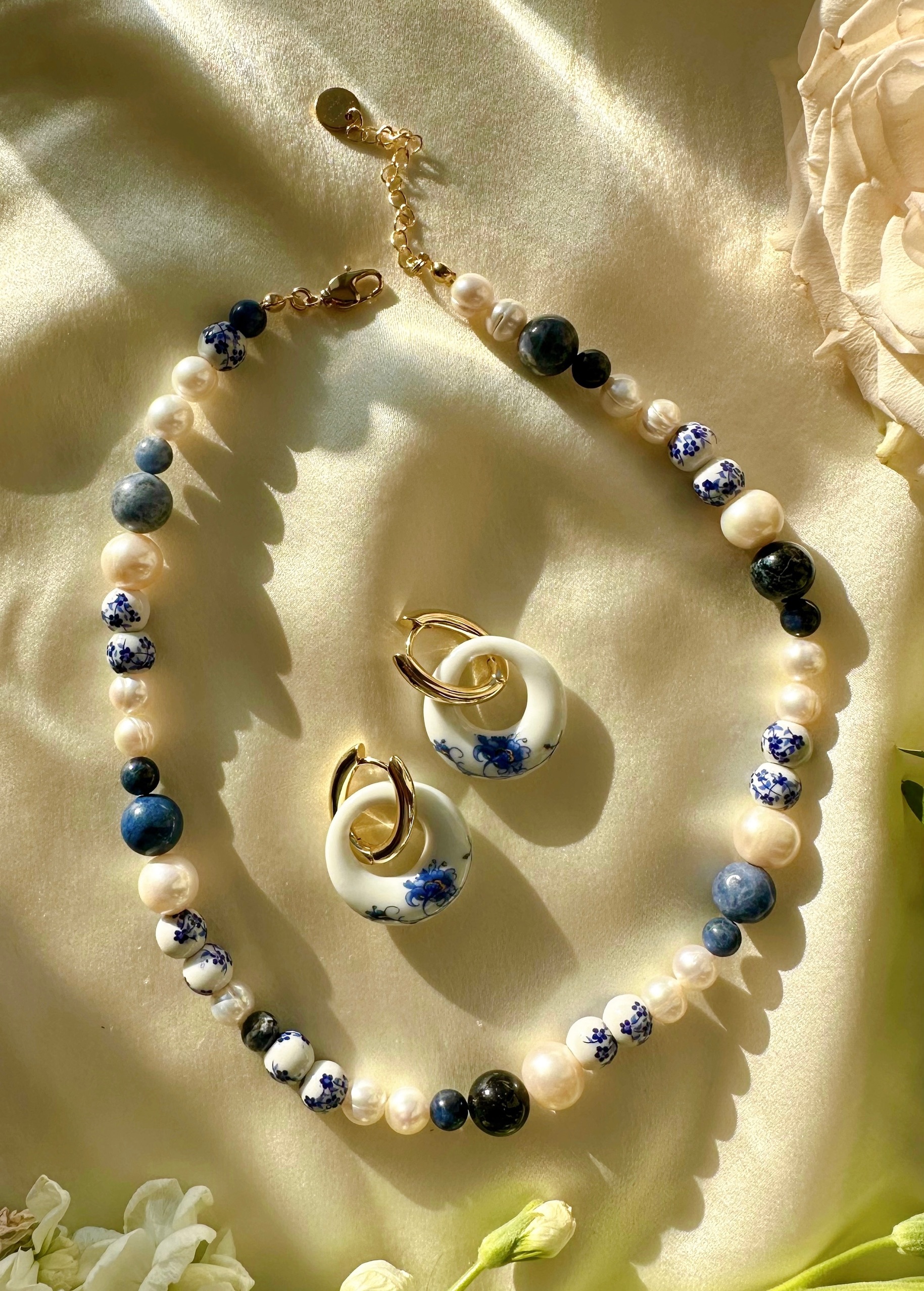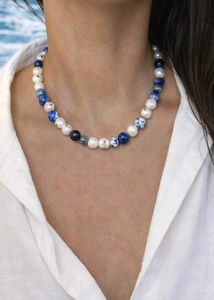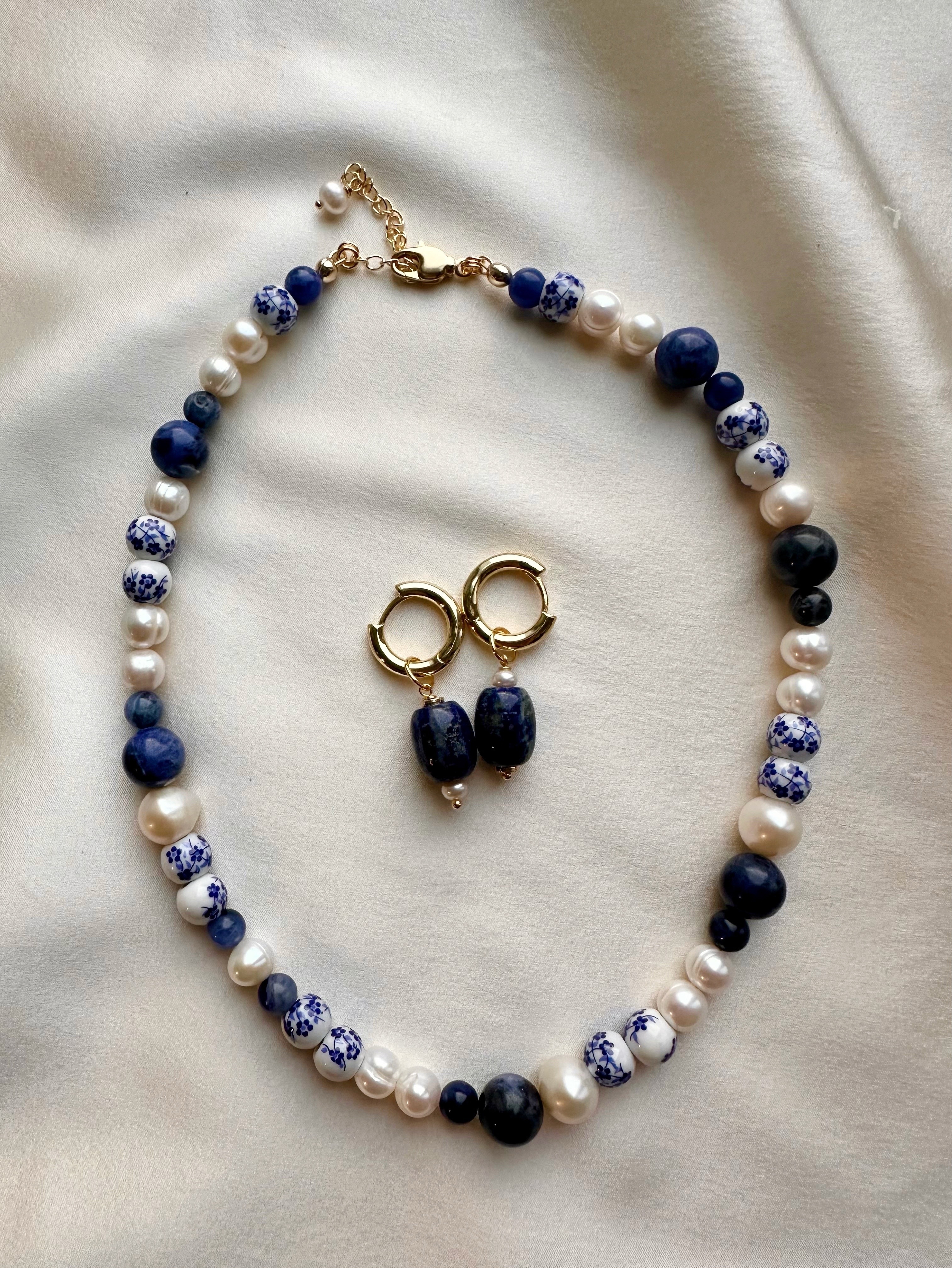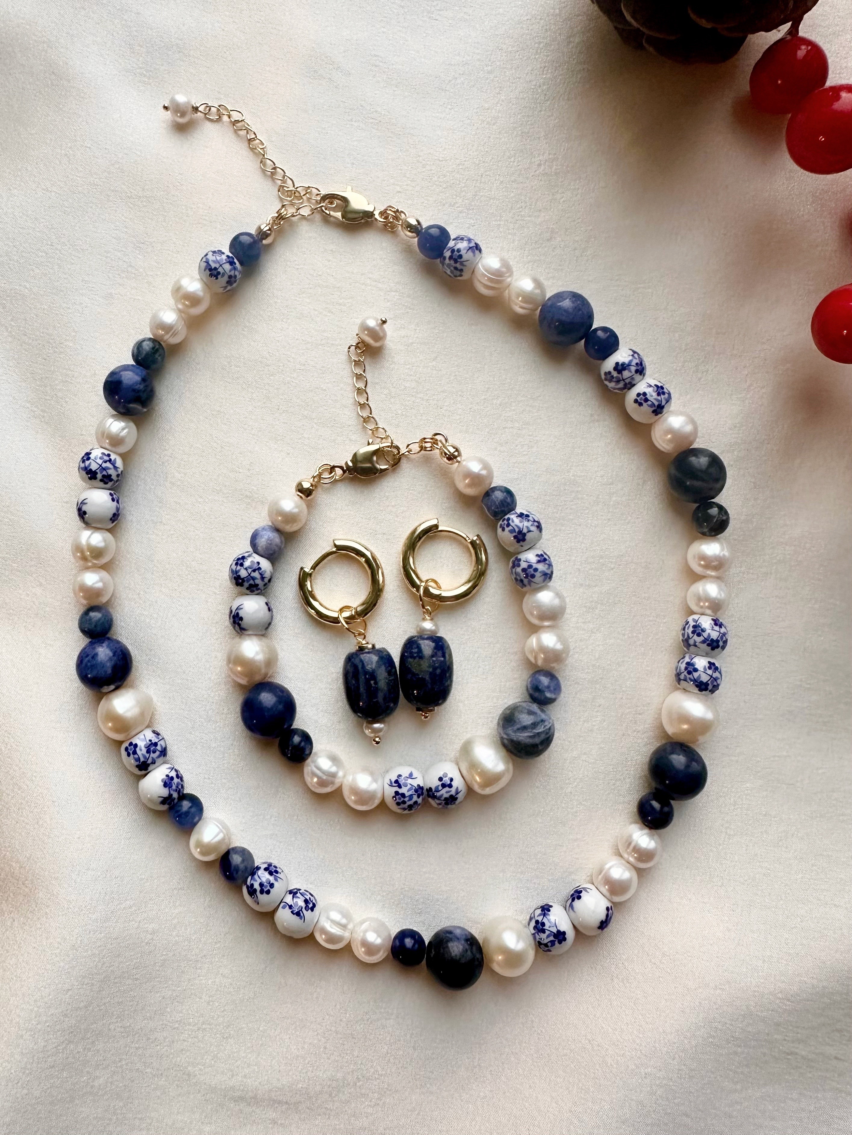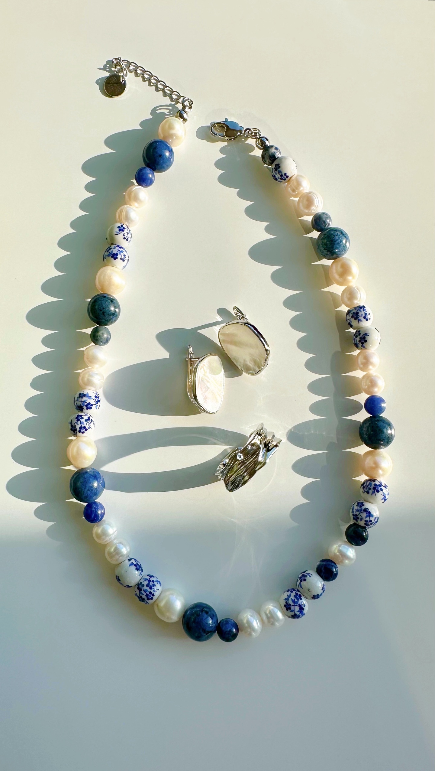 Ожерелье из натурального содалита с натуральным жемчугом и бусины с рисунком Гжель