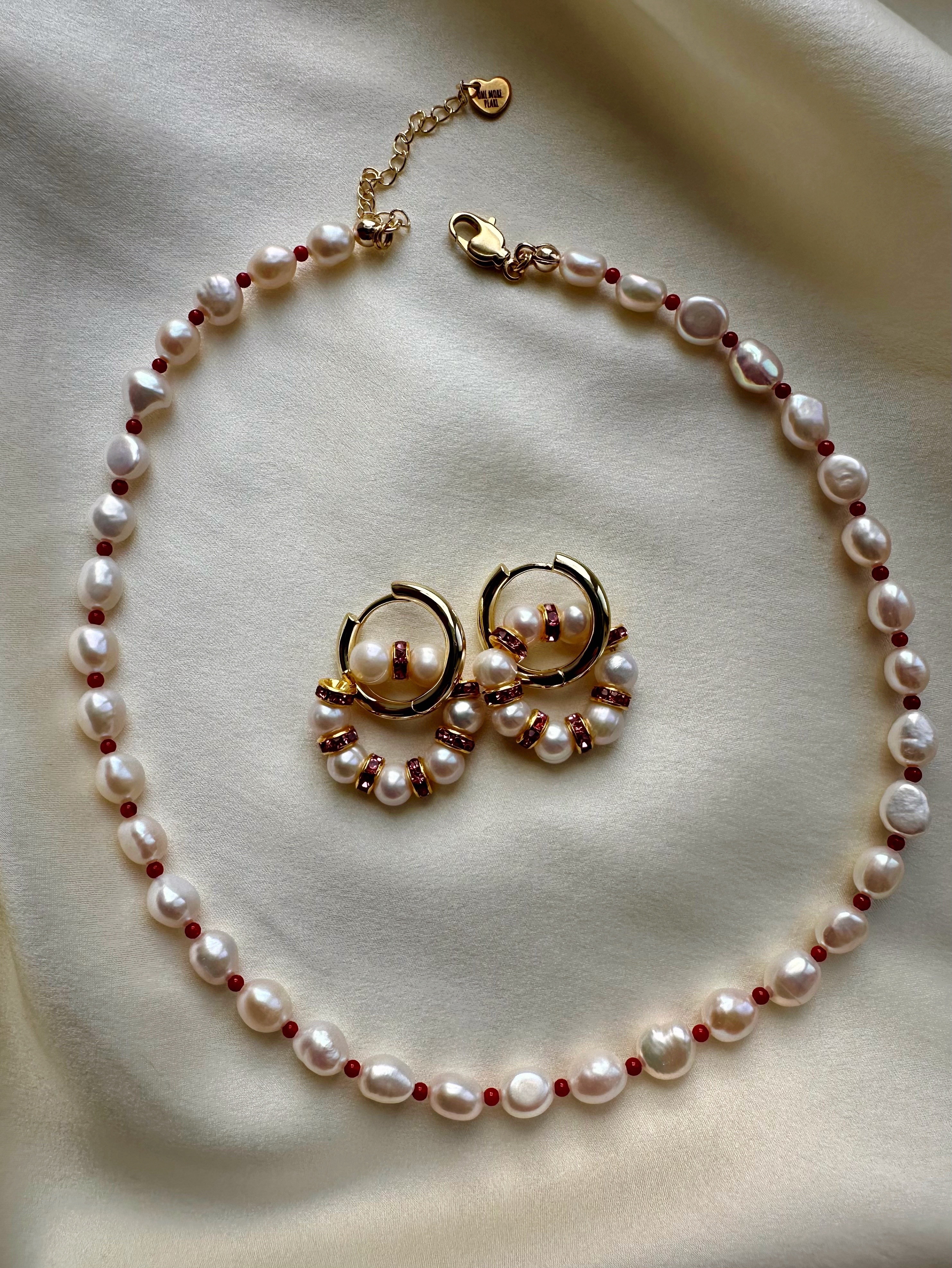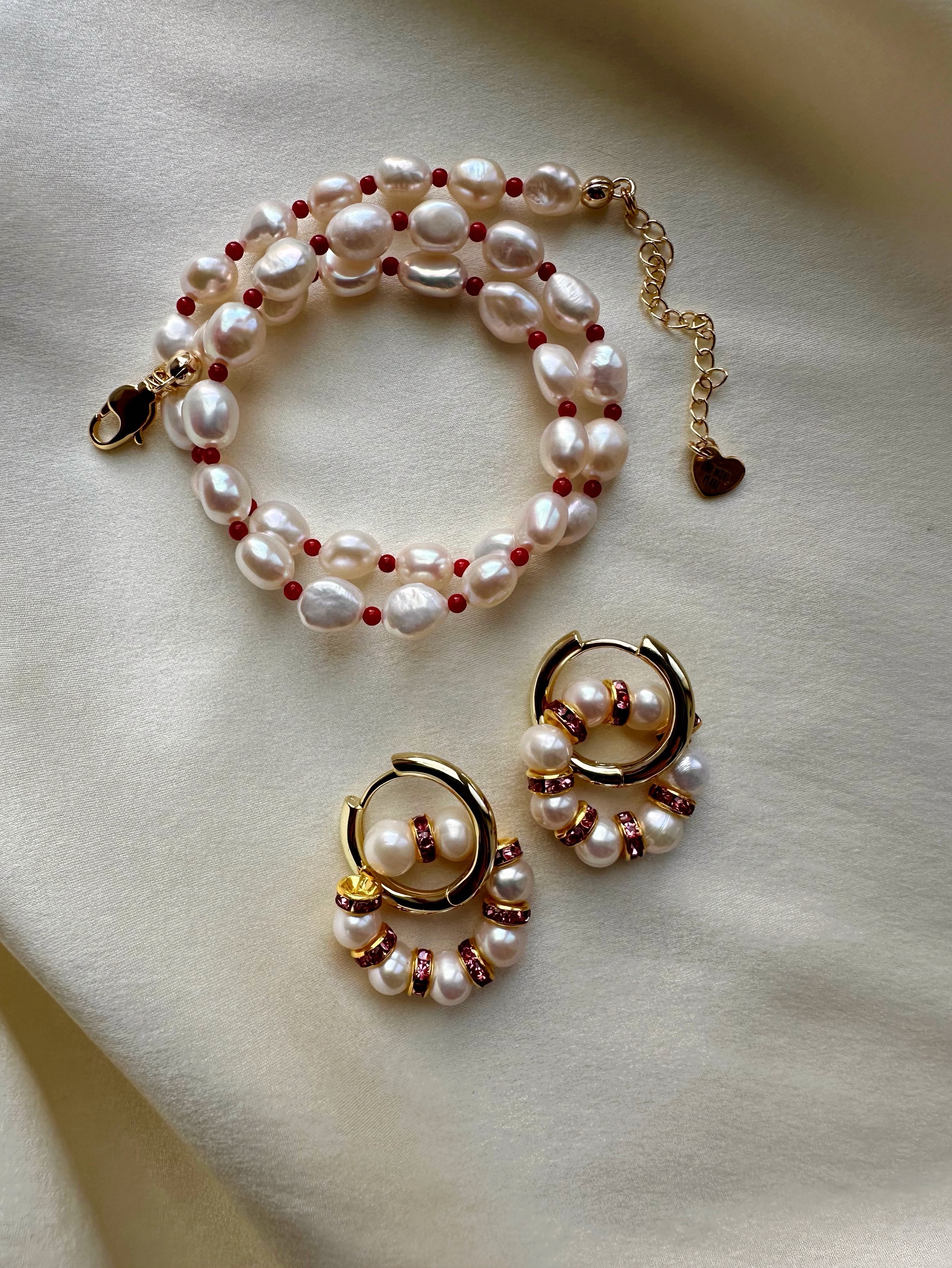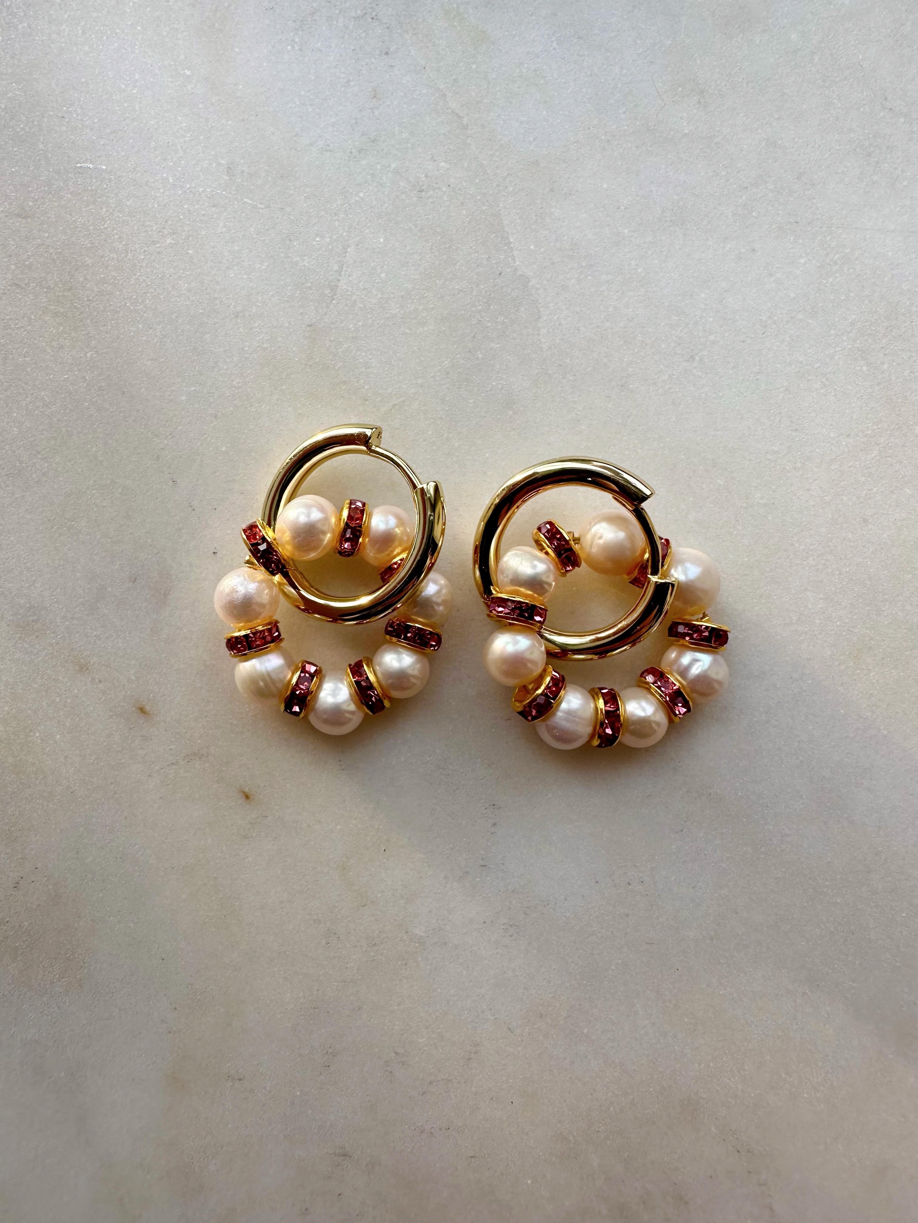 Серьги из Натурального пресноводного культивированного жемчуга и розовых кристаллов в форме колец