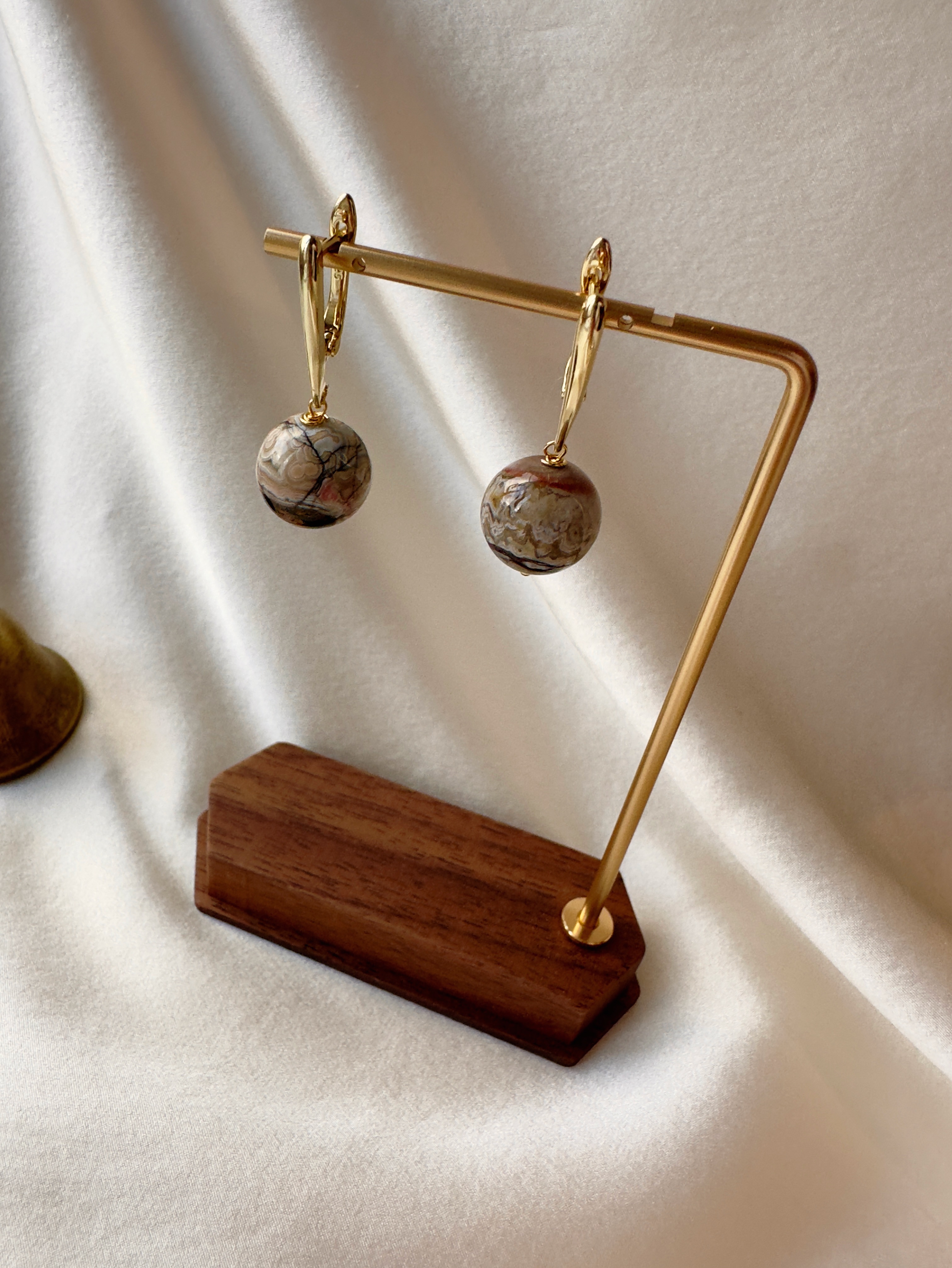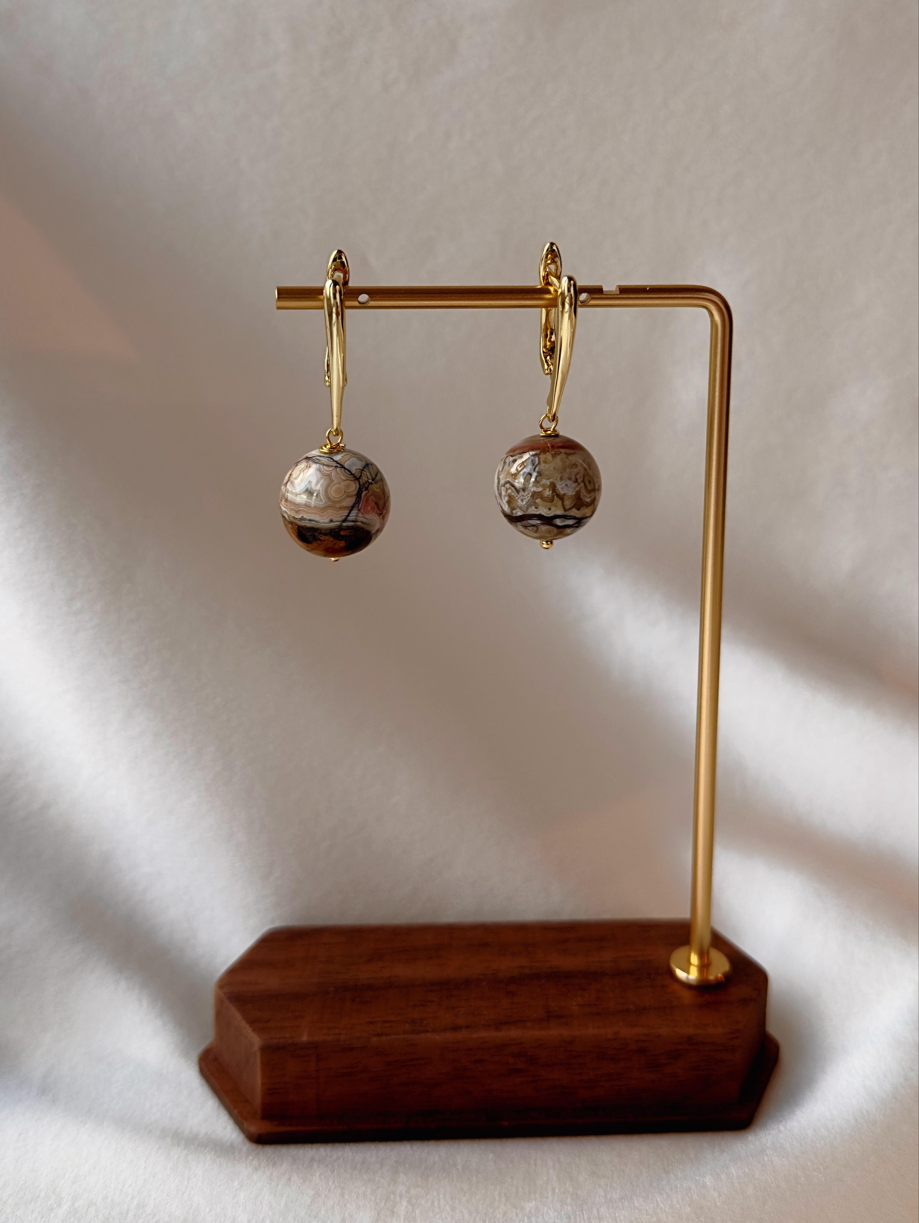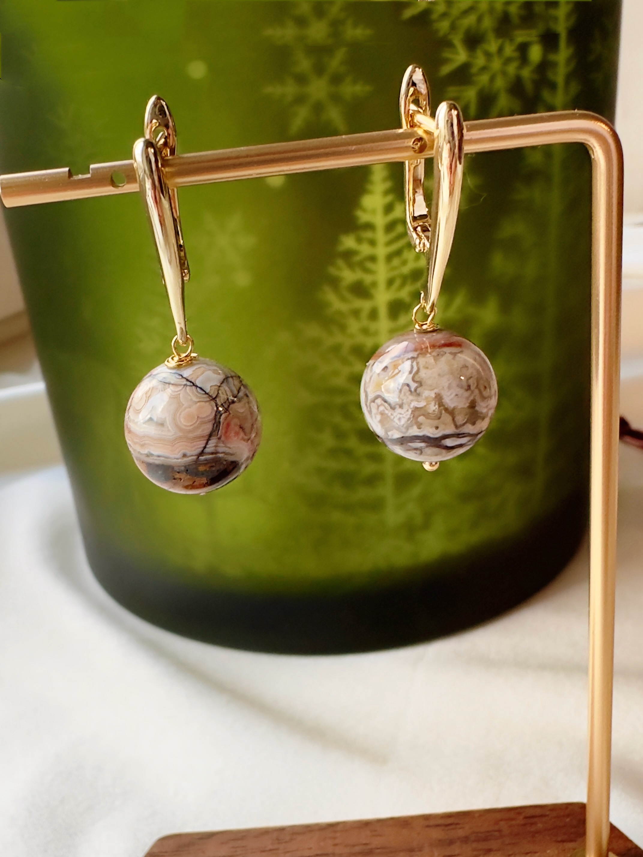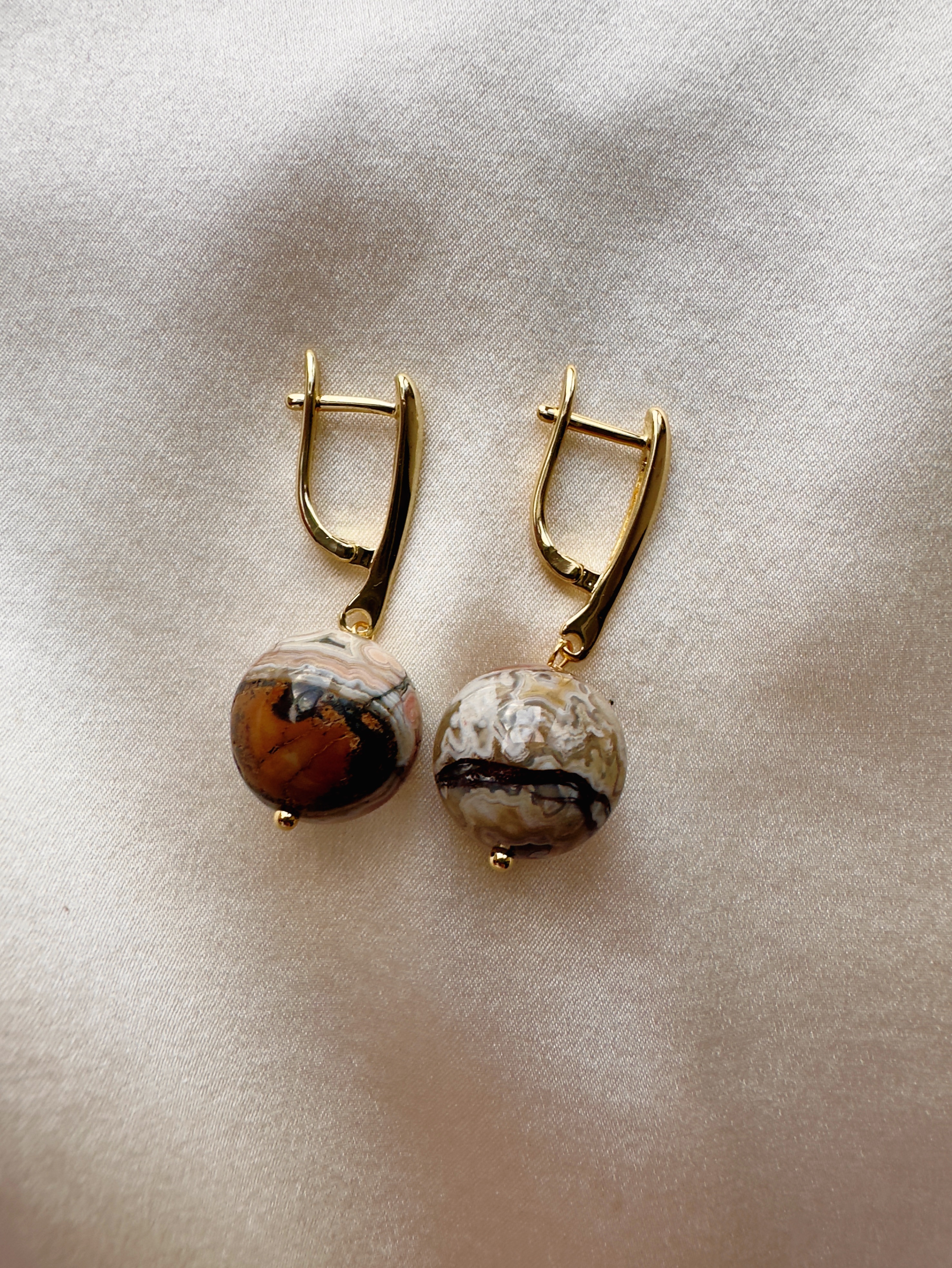 Серьги из латуни Золото 18к с натуральным мексиканским агатом размер 14 мм форма шар
