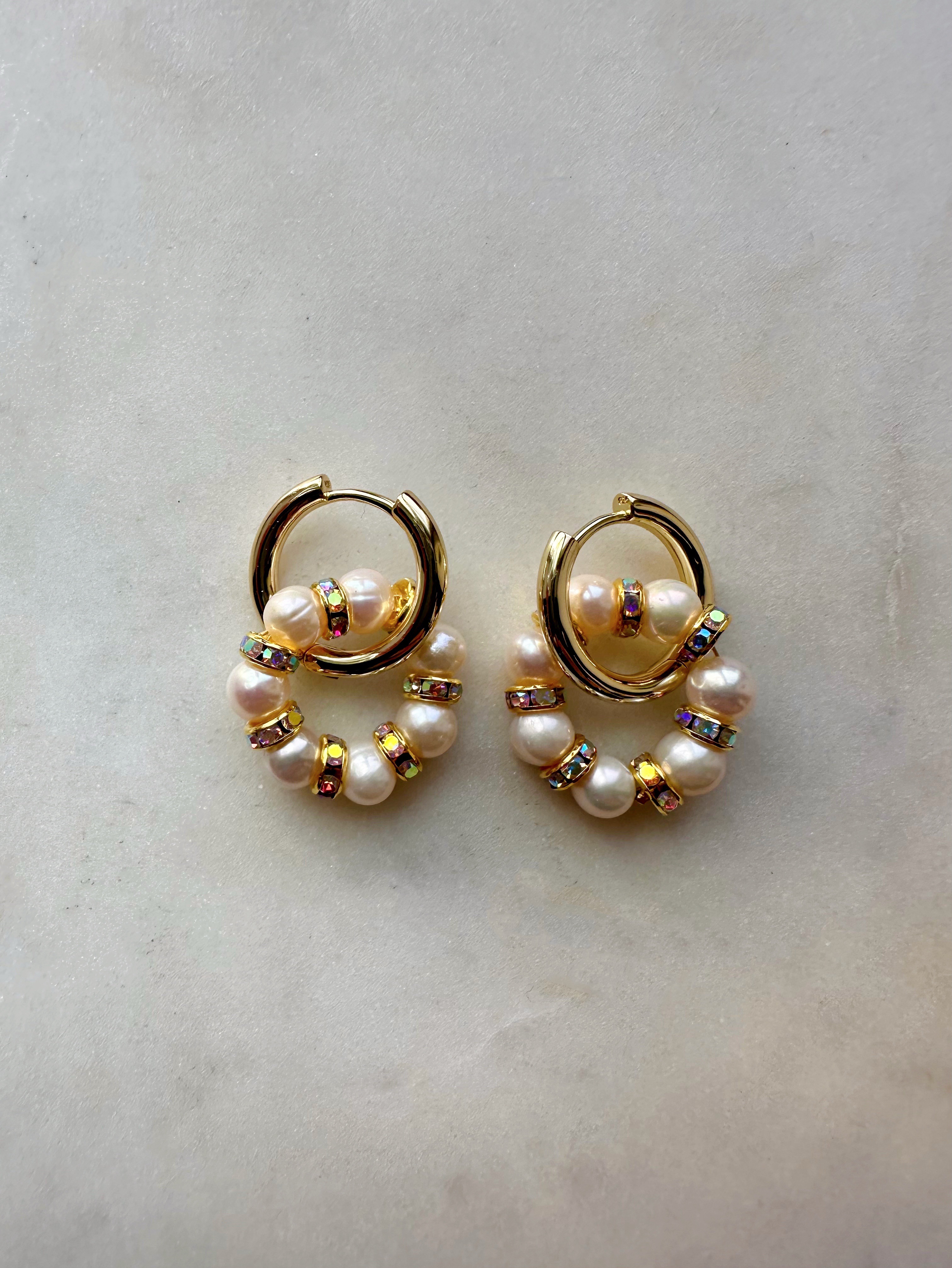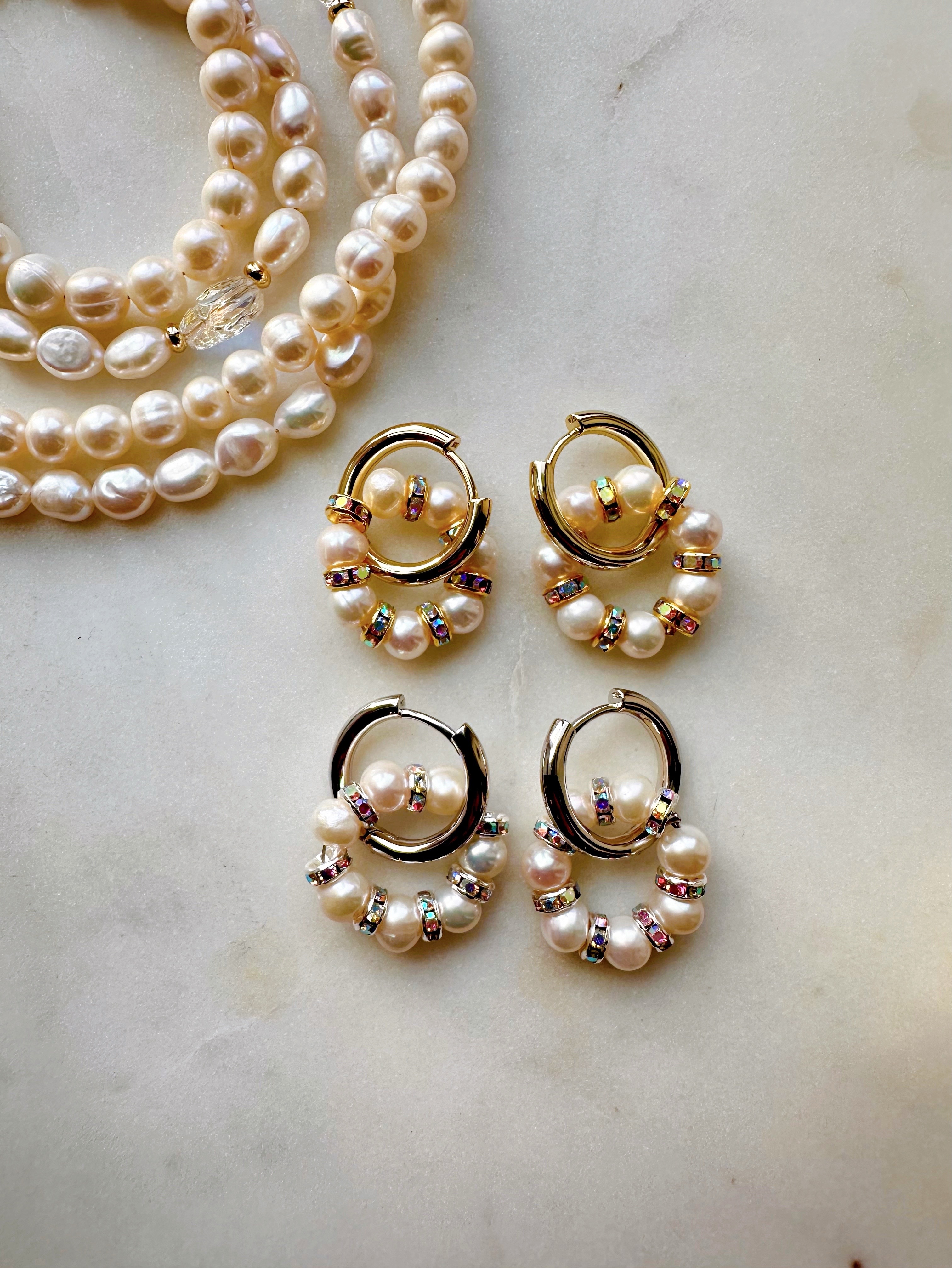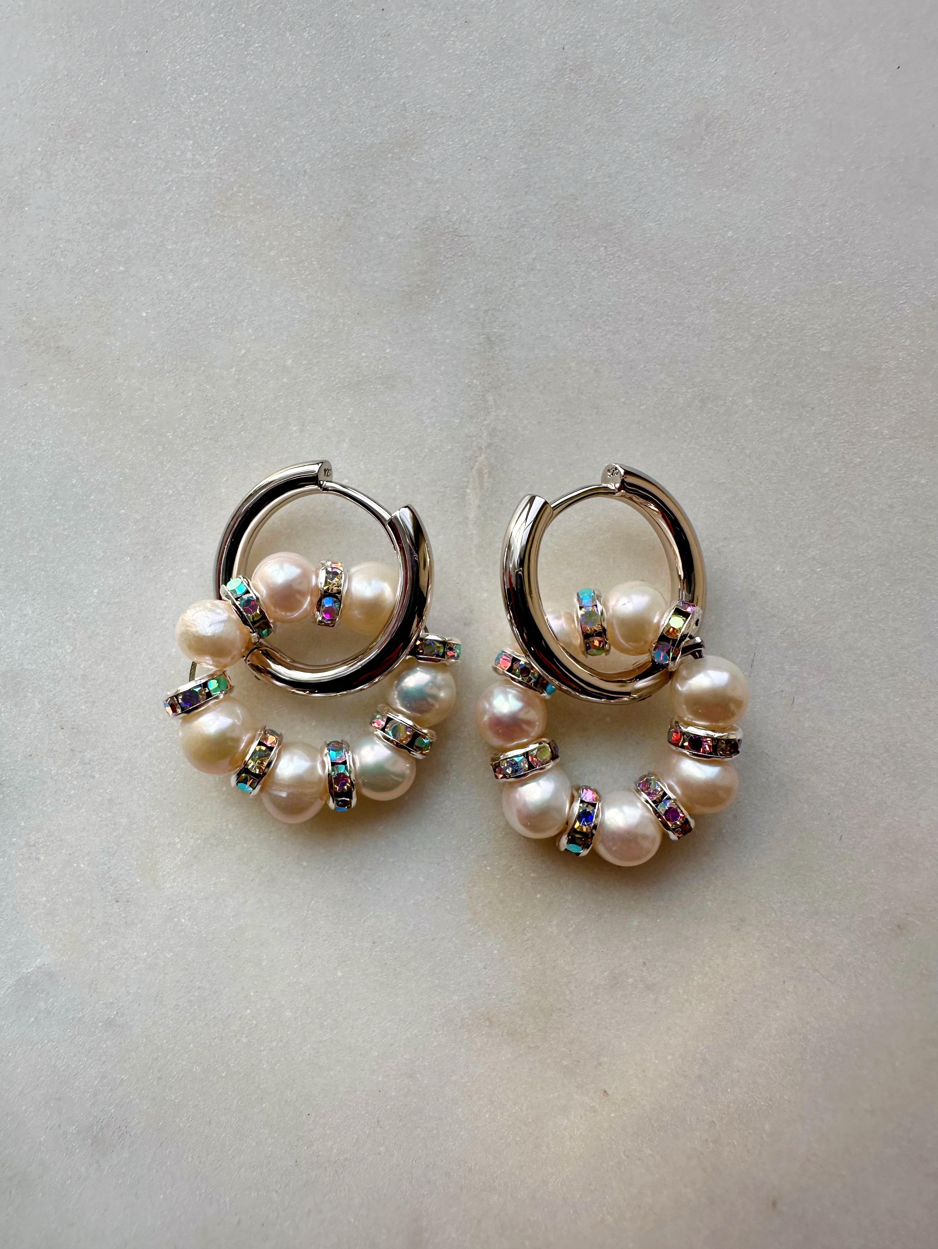 Серьги из Натурального пресноводного культивированного жемчуга и розовых кристаллов в форме колец