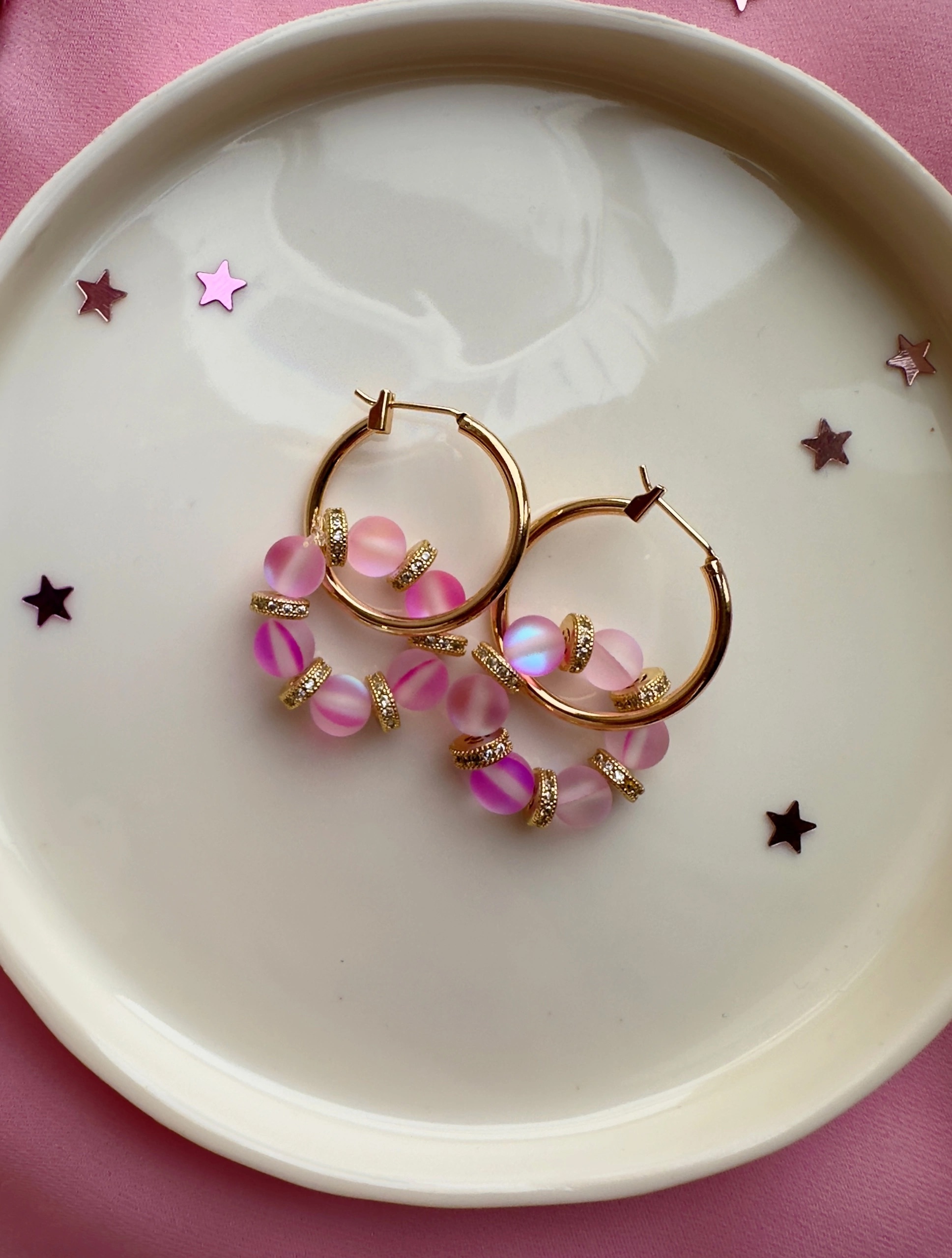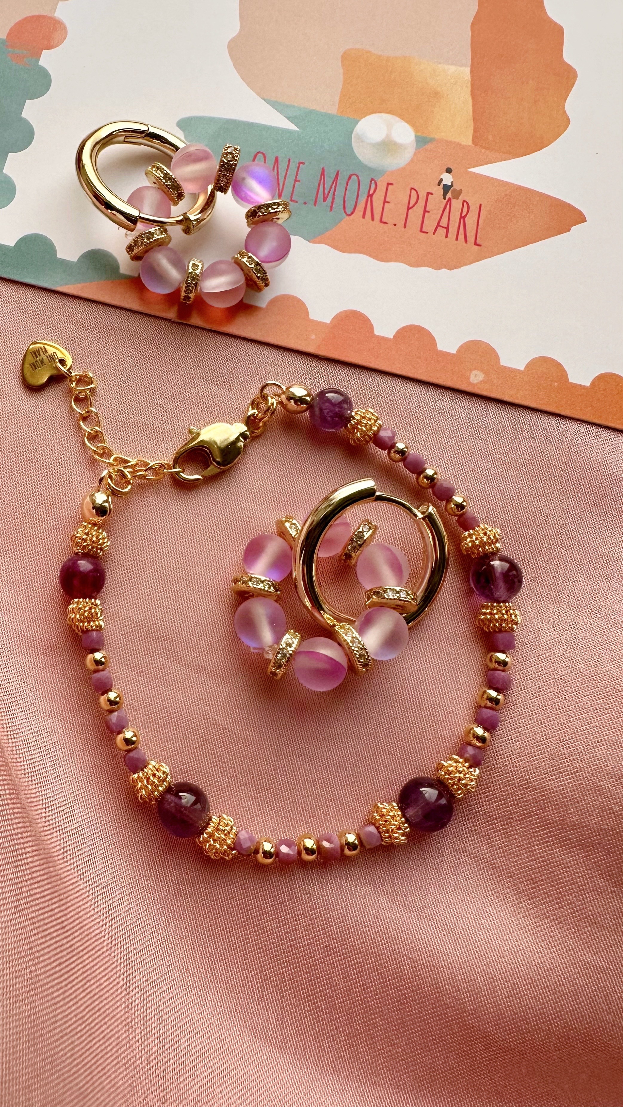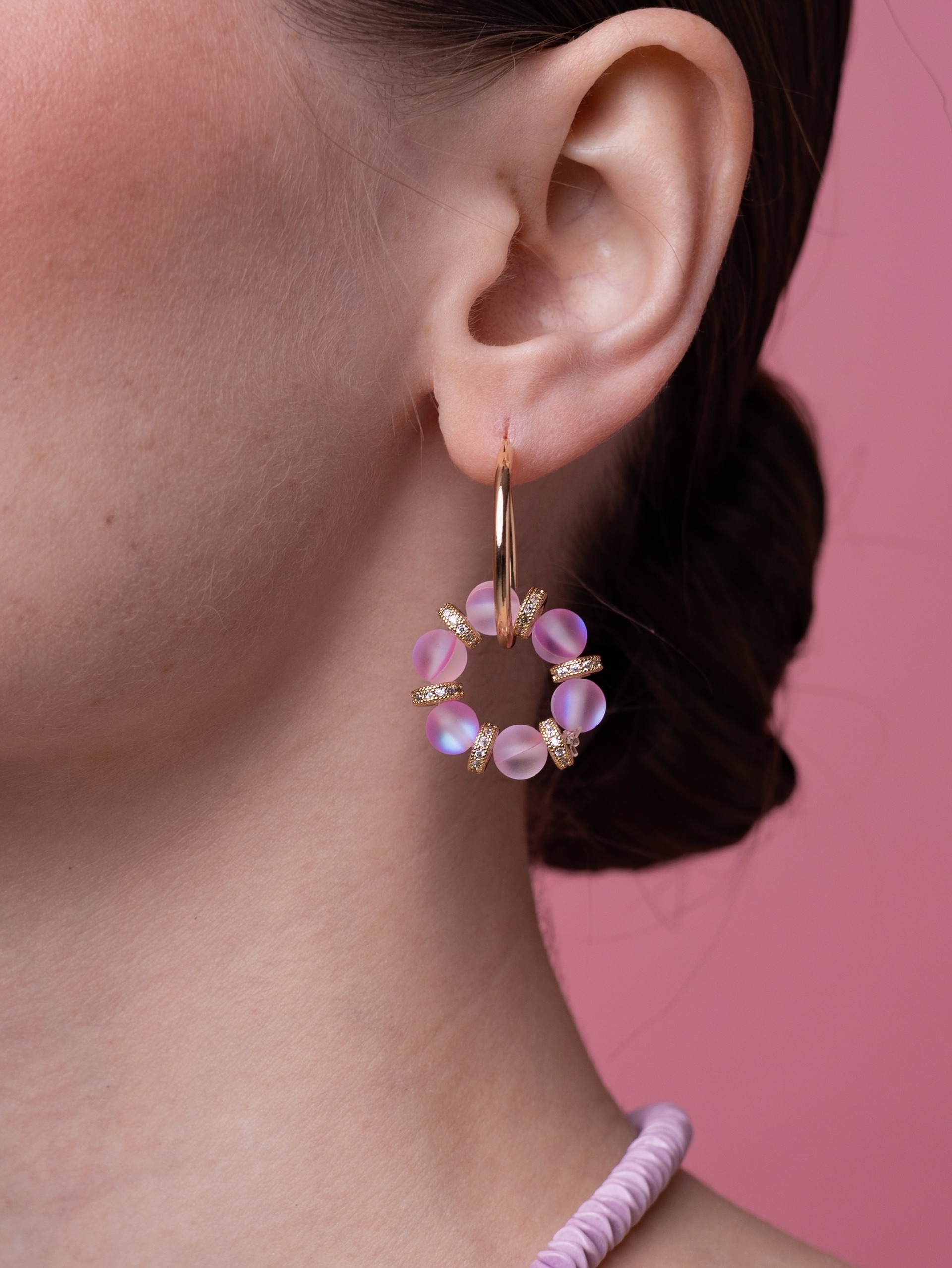 Серьги со спейсерами с фианитами из латуни покрытие Золото 18карат и лавандовым синтетическим опалом