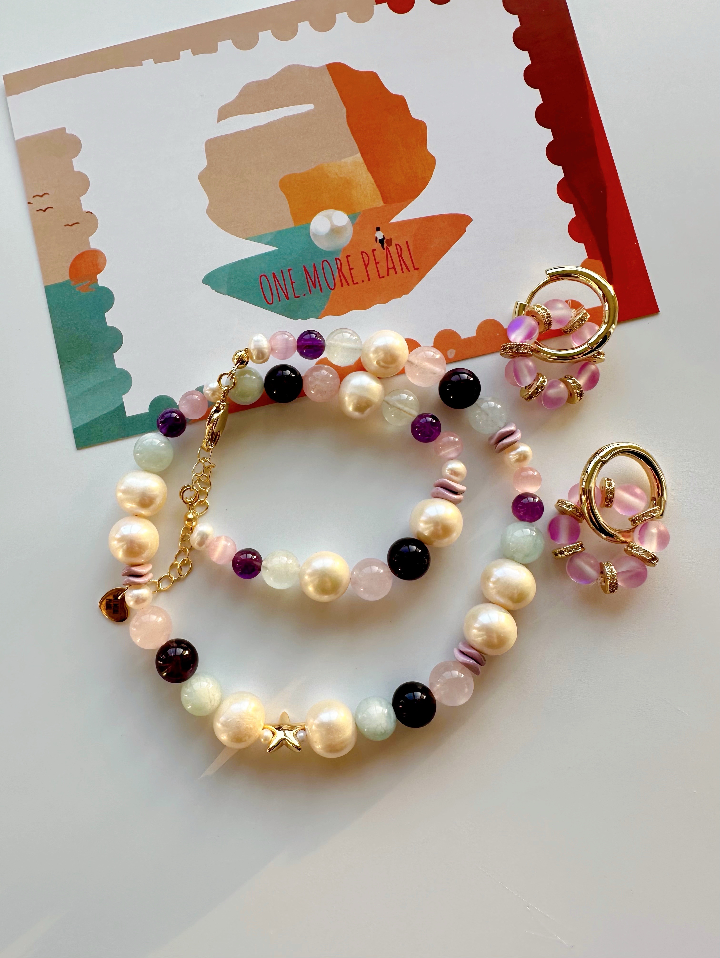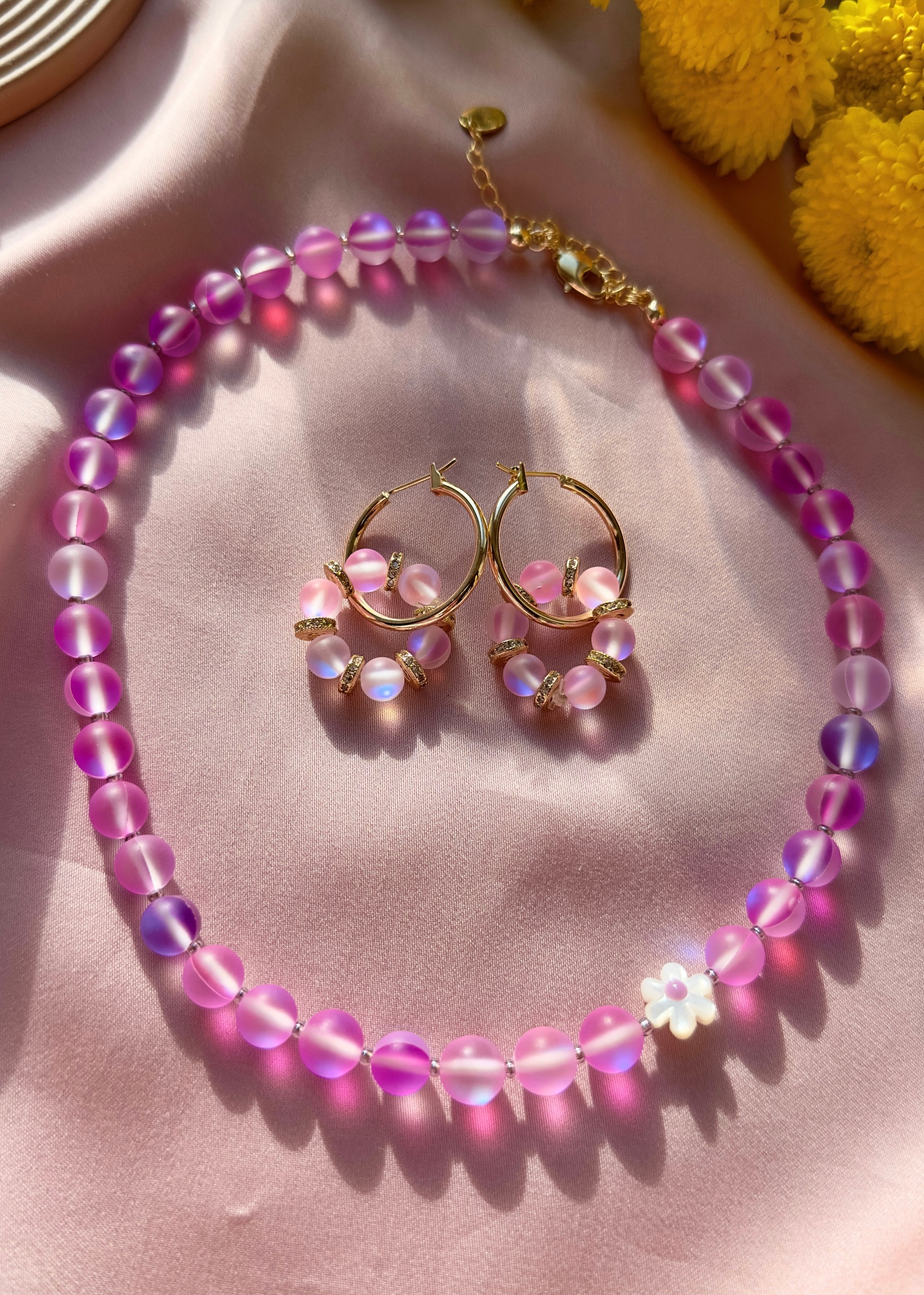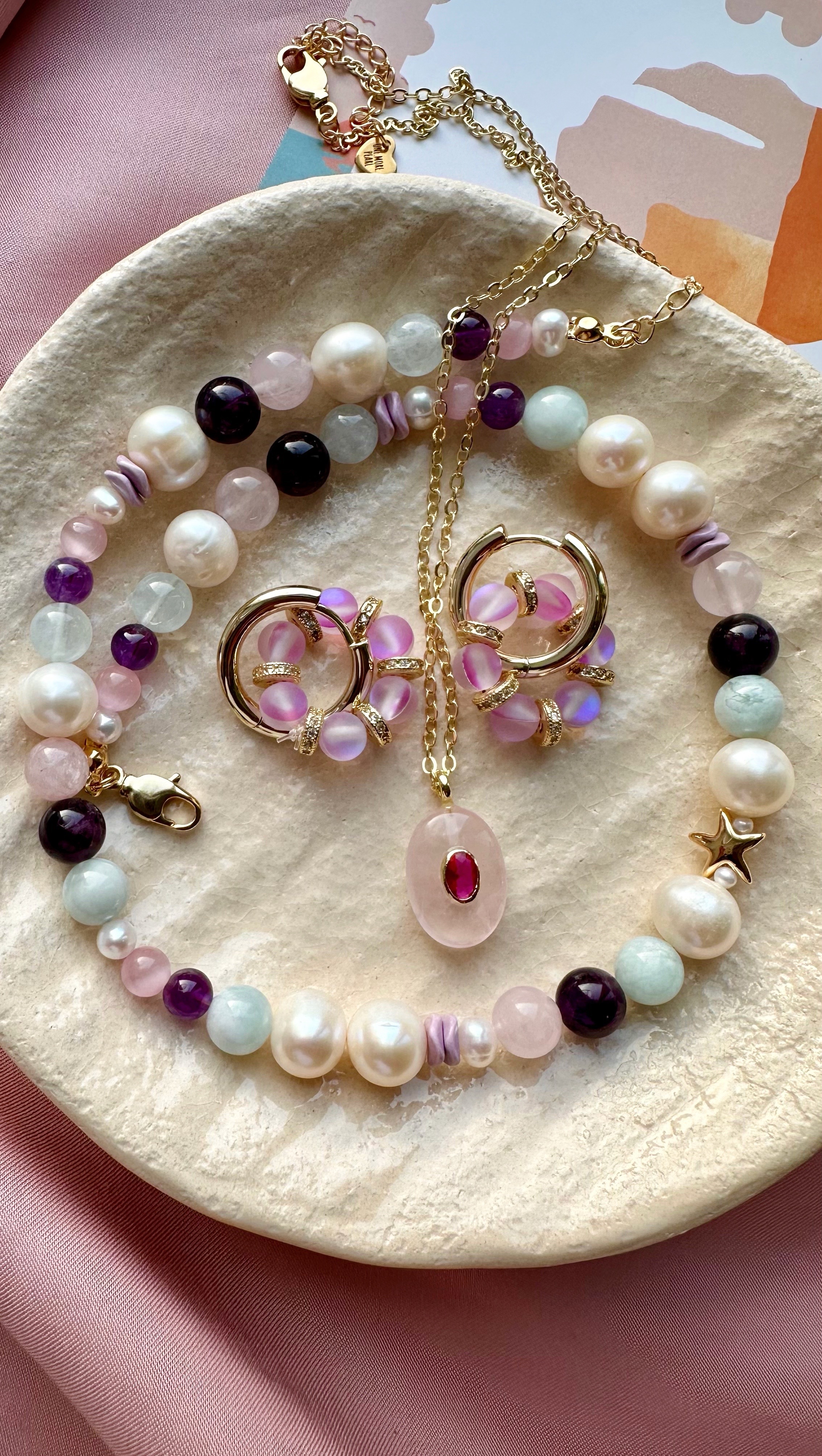 Серьги со спейсерами с фианитами из латуни покрытие Золото 18карат и лавандовым синтетическим опалом