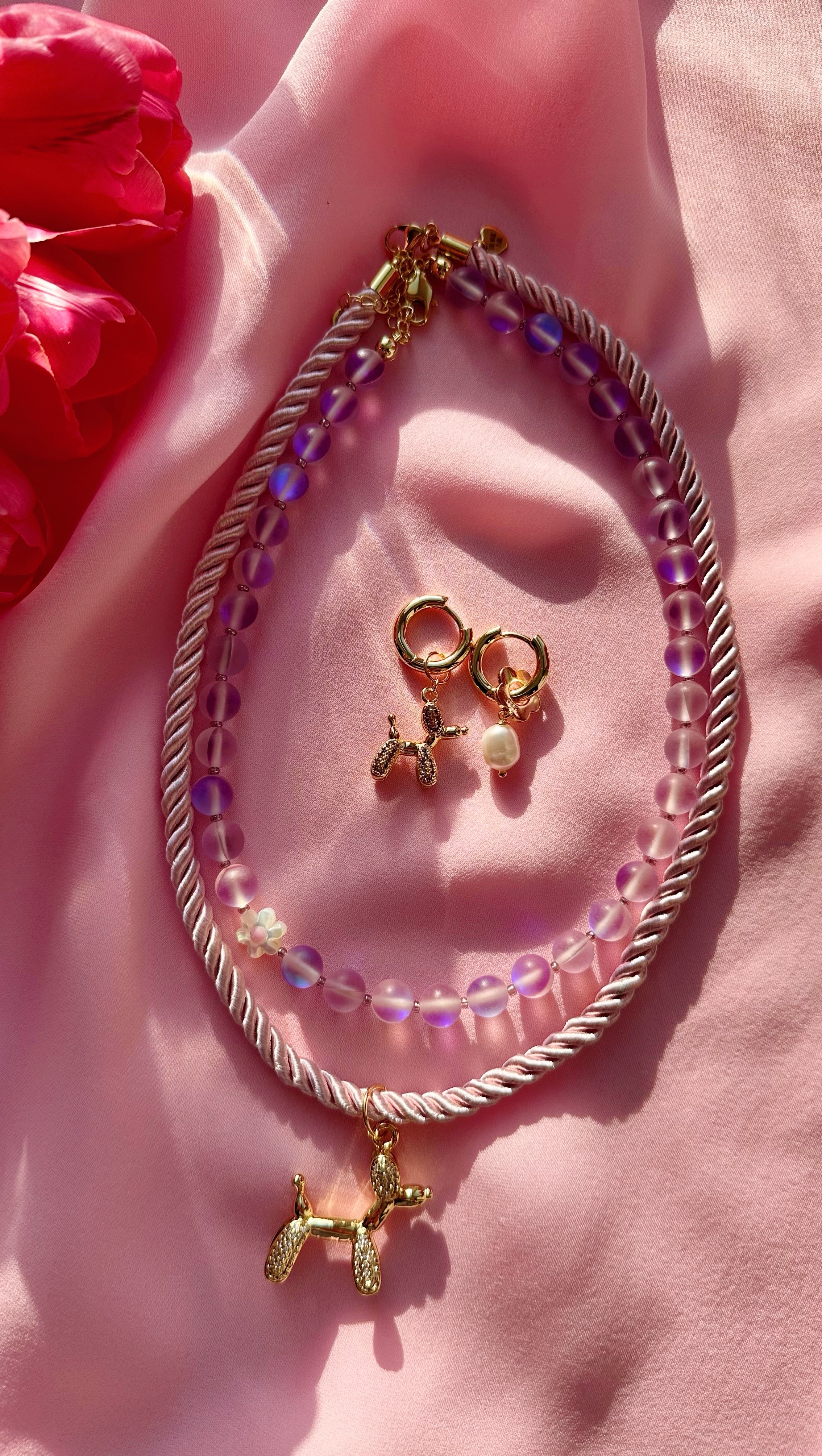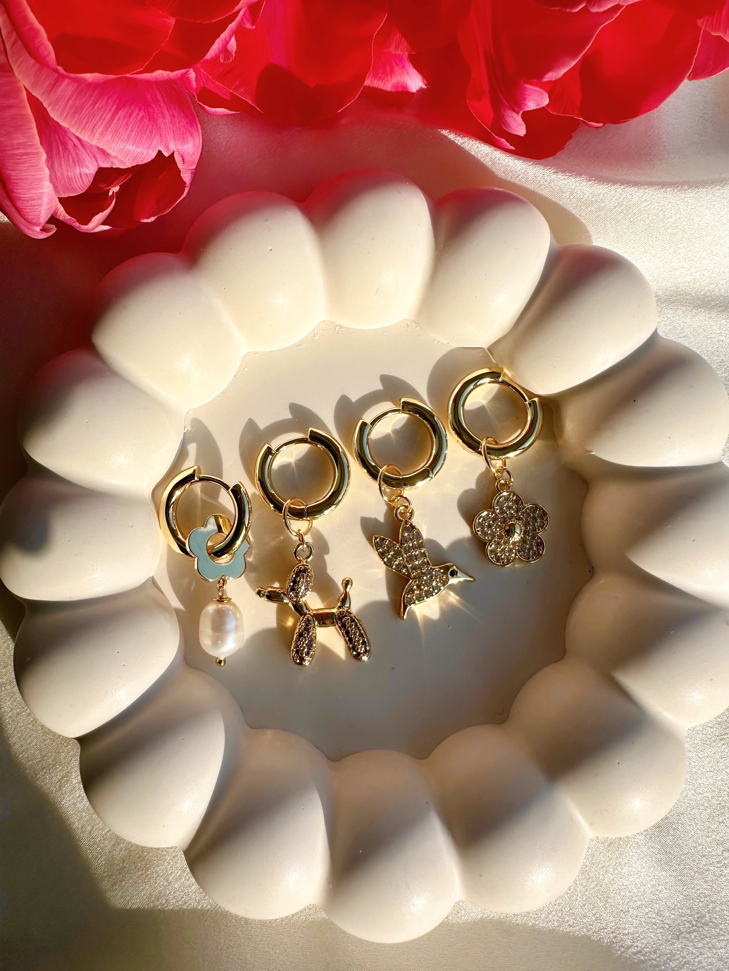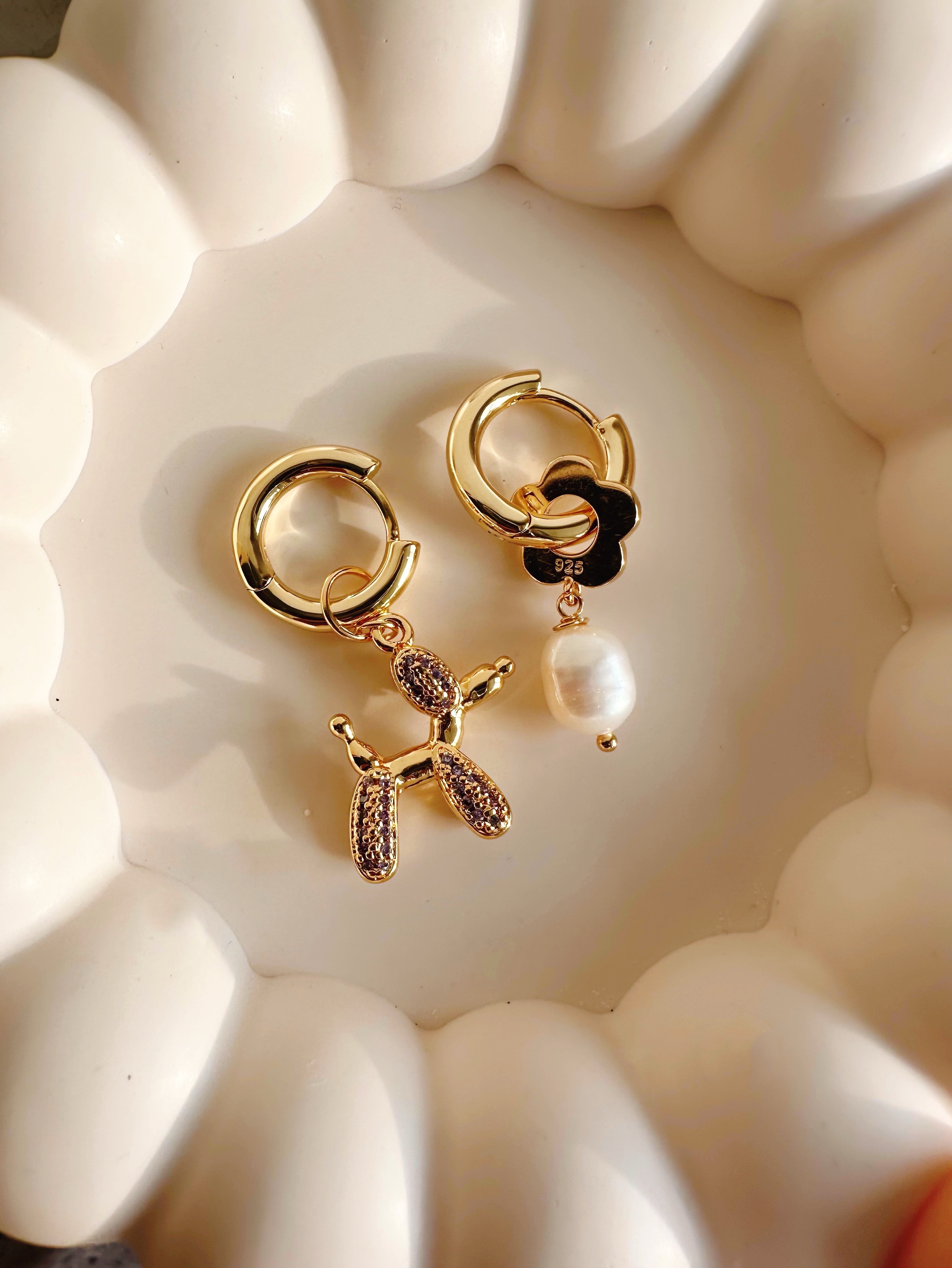 Серьги с подвесками из латуни покрытие Золото 18карат: Цветок с Натуральным пресноводным культивированным жемчугом и пудель в фианитах