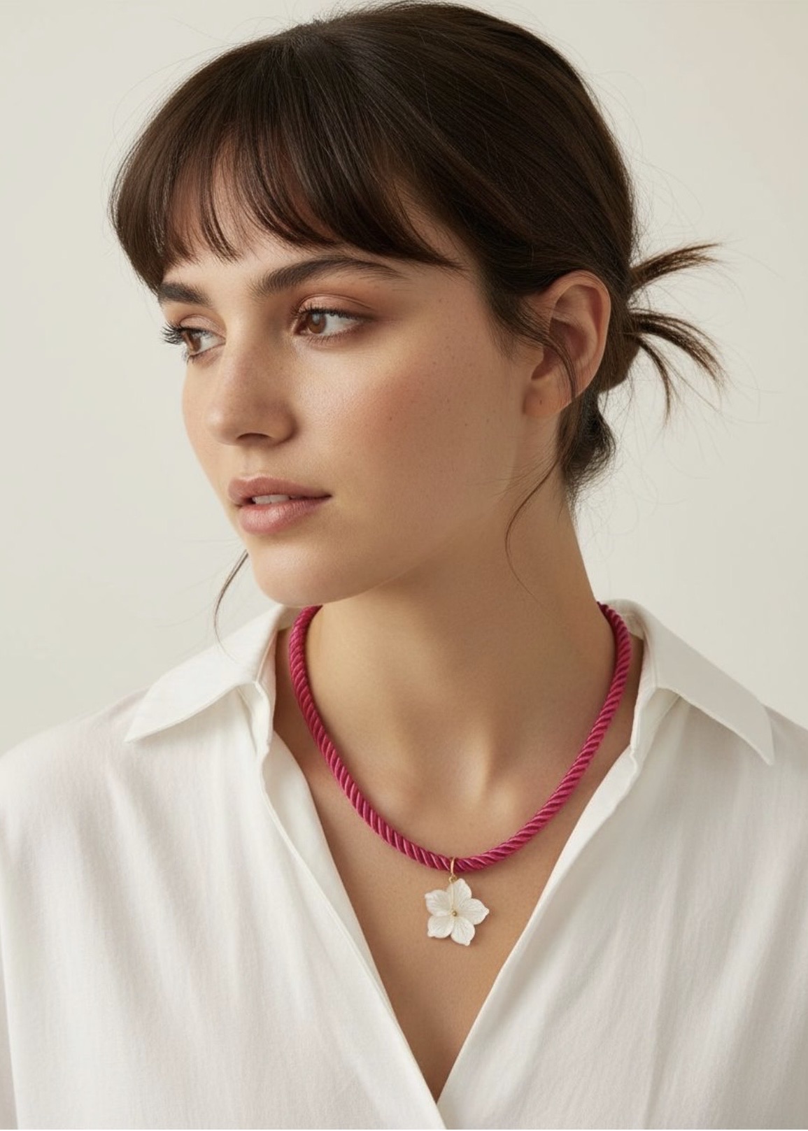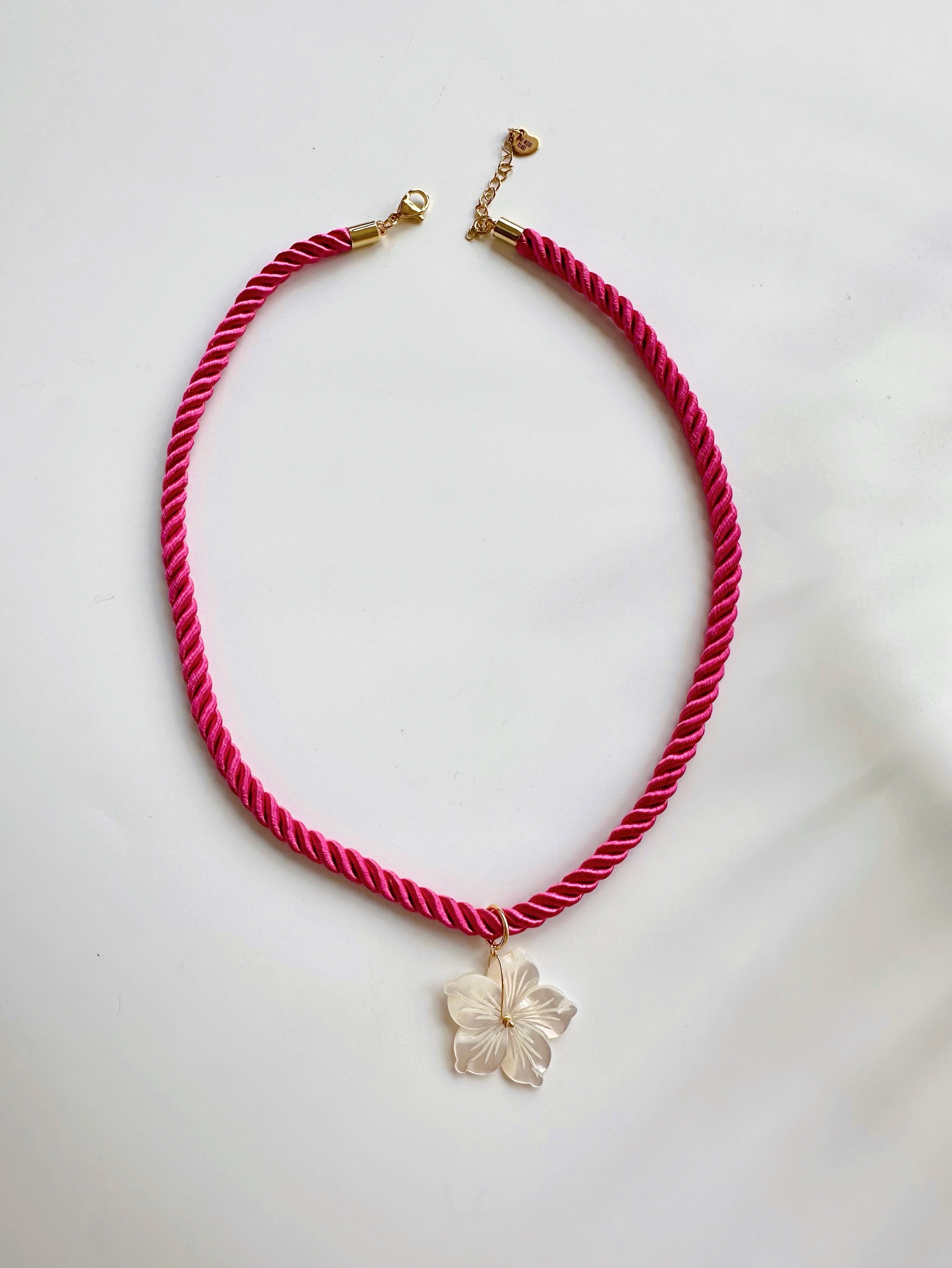 Чокер шнур фуксия + подвеска цветок крупный натуральный перламутр