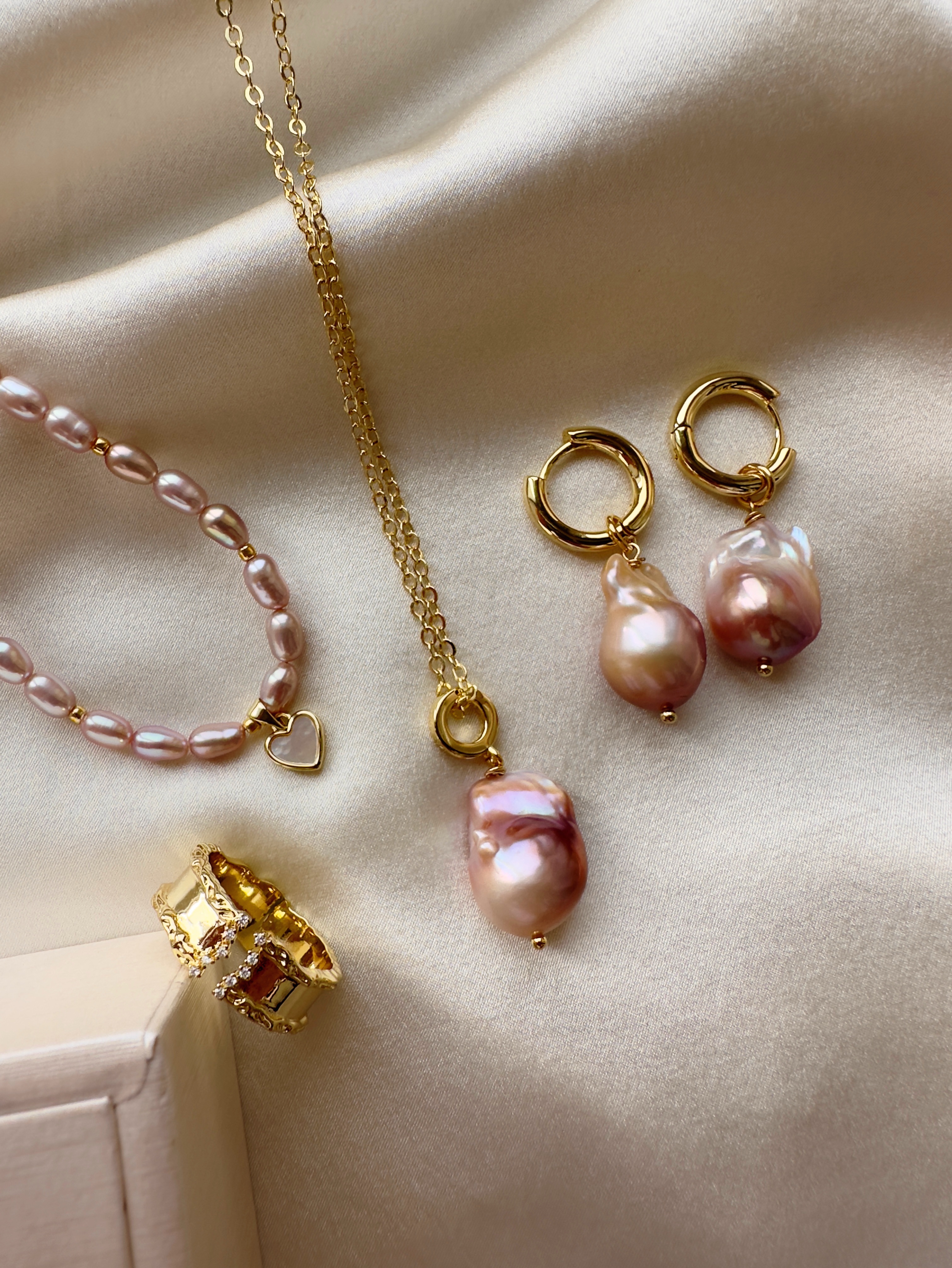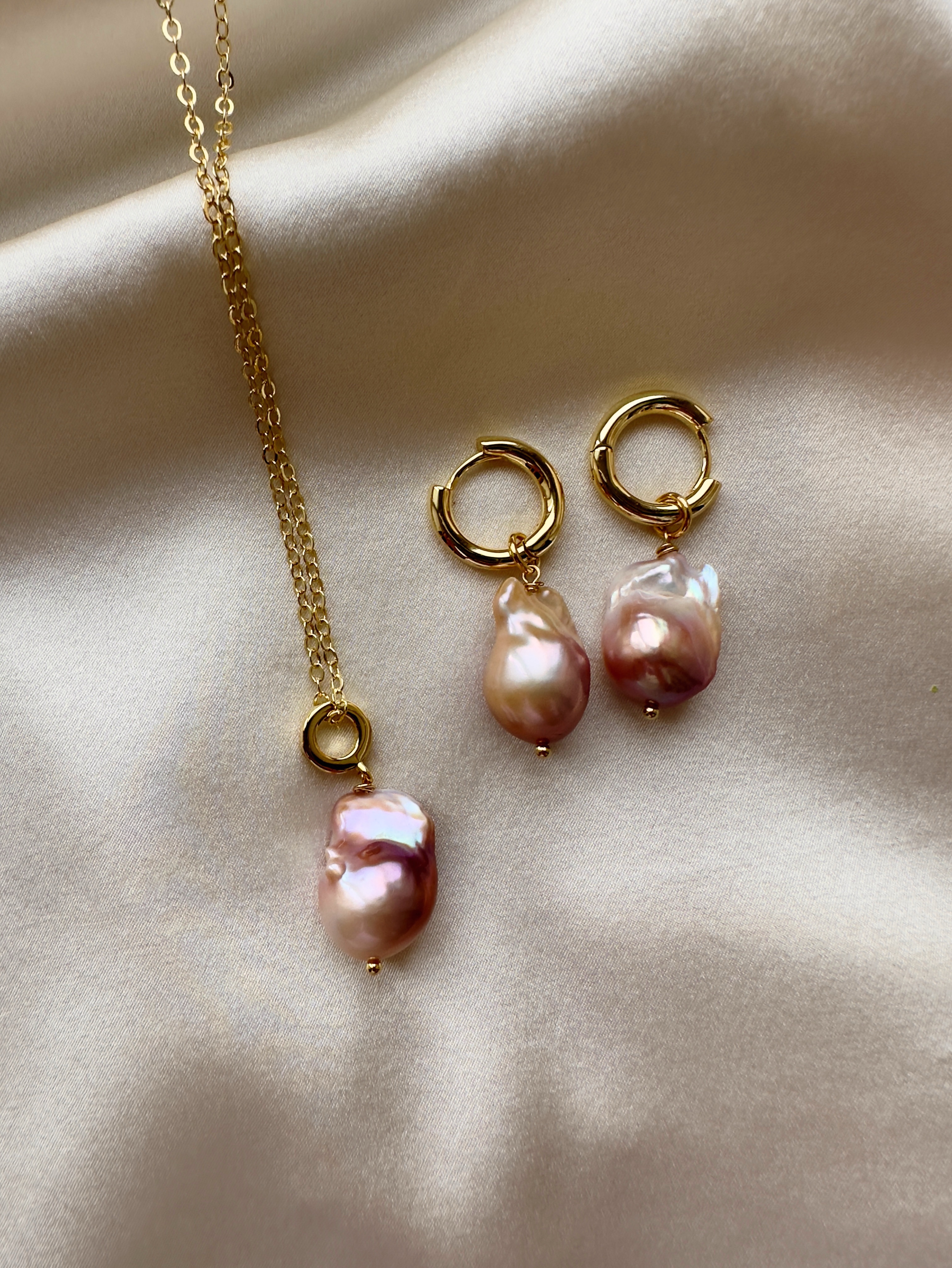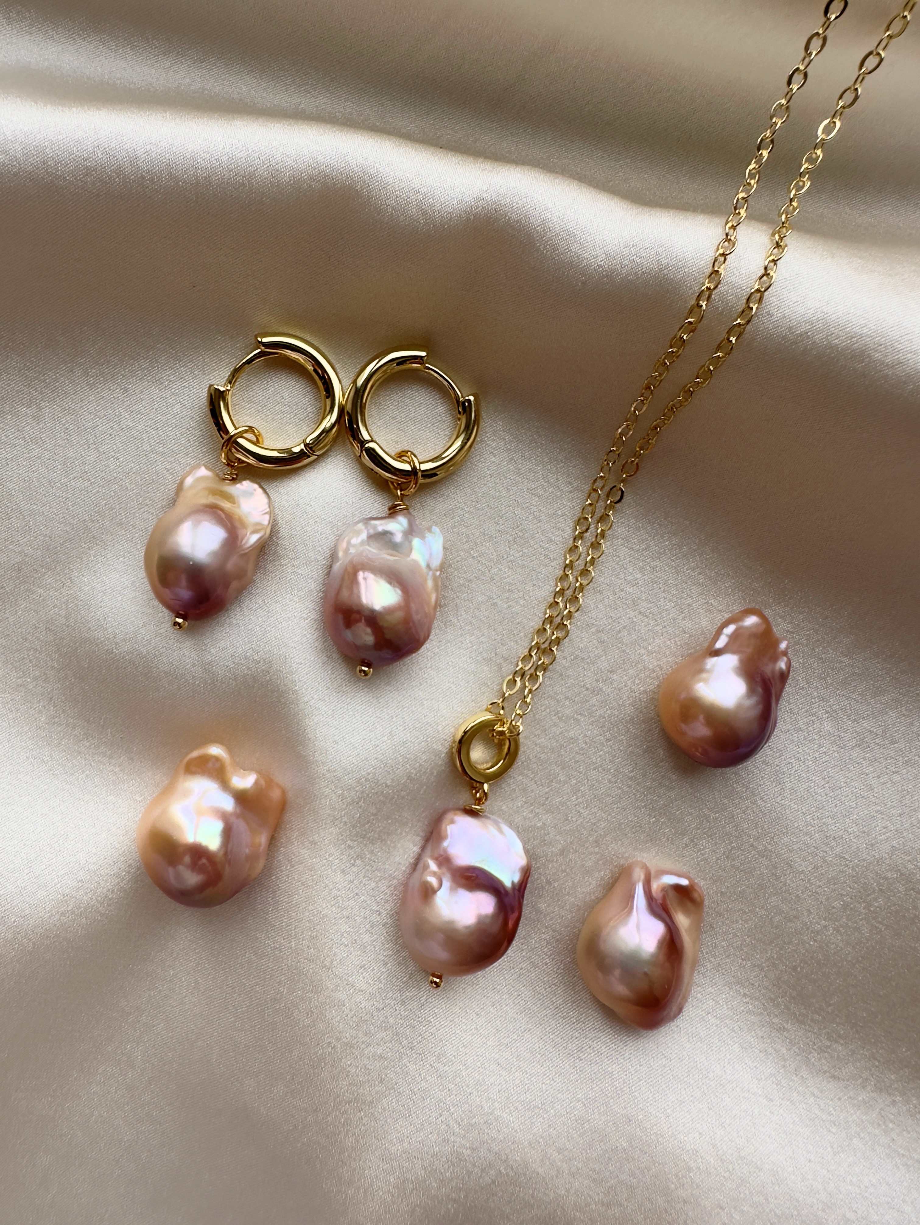 Цепочка с подвеской из Натурального розового пресноводного культивированного жемчуга форма барочная крупная 16-18 мм